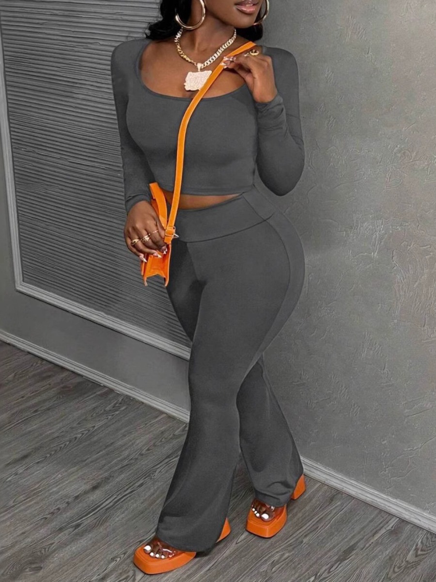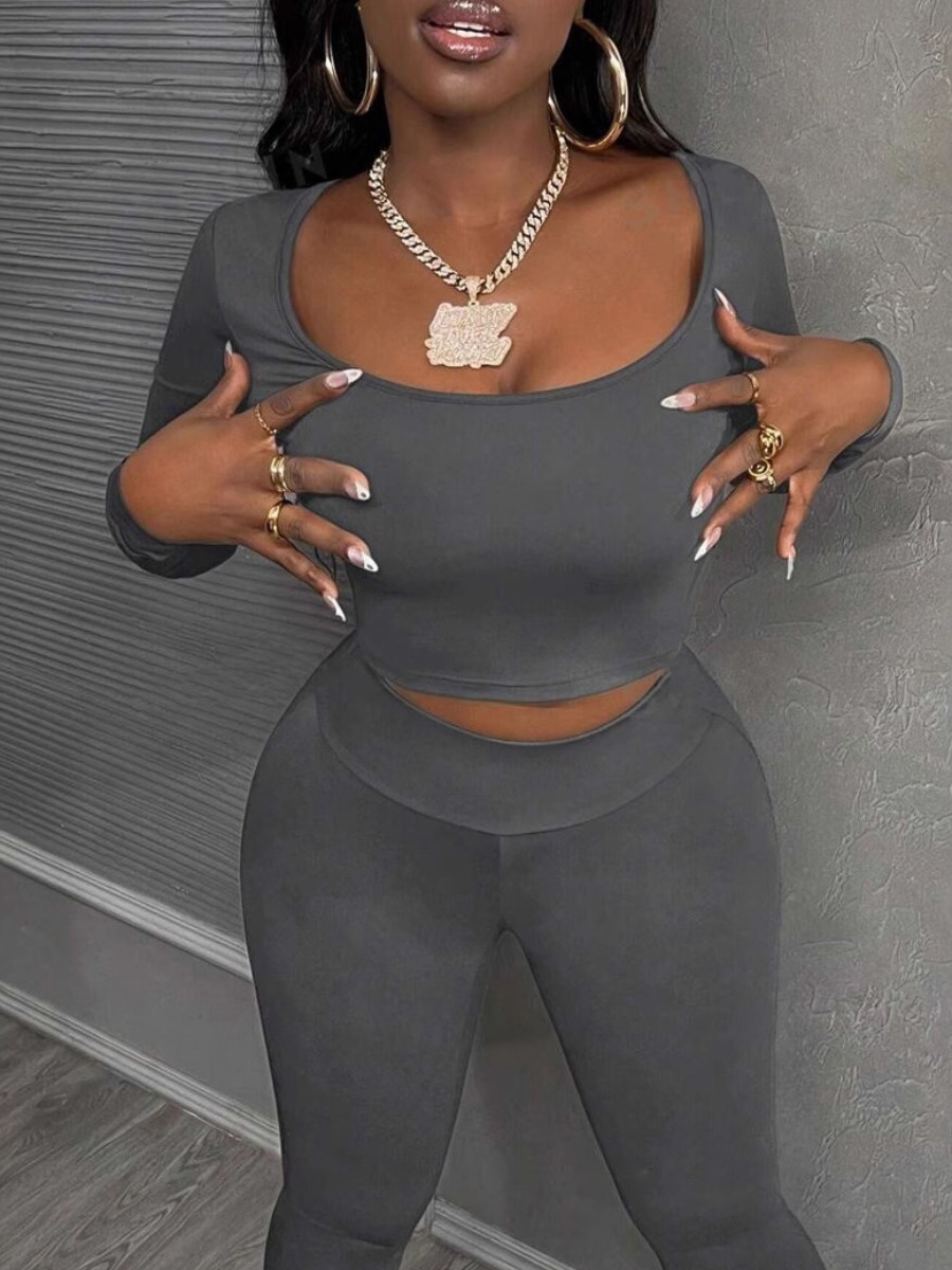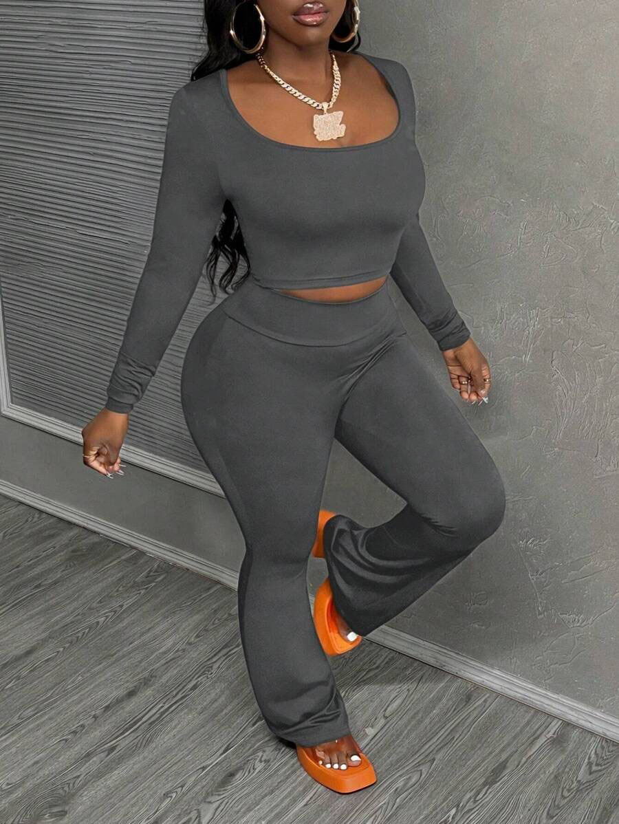LW BASICS Casual Polyester U Neck Solid Color Long Sleeve Two-piece Pants Set.