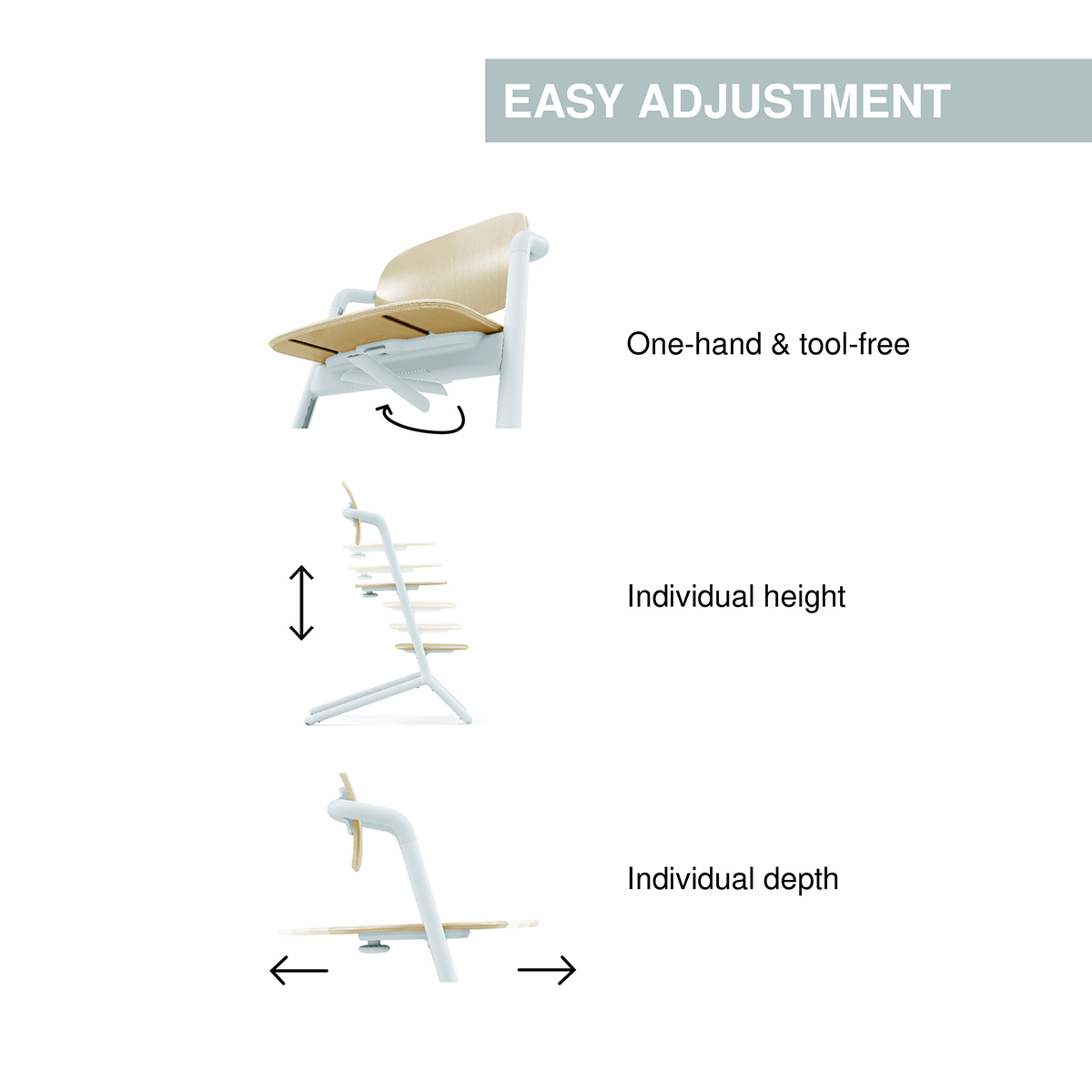 The CYBEX LEMO 2 high chair is a timeless piece that can be used from 3 to 99 years. As your child grows, easily adjust the seat height and depth for a comfortable fit and enjoy for many years to come. No tools are required and only one hand is needed to make to adjust the chair's height and depth; The Lemo is a timeless furniture piece for ages up to 99 years, with the bouncer nest and baby set providing support when needed (accessories not included); Featuring an intuitive design with clean and minimalist lines, the Lemo is a long-lasting furniture concept meeting all your child's needs; Numerous depth positions ensure comfortable seating as your child grows; Always the perfect fit: Individual height adjustment allows optimized, ergonomic seating for all ages; Wheels on the rear legs reduce tipping risk and make it easy to move the chair around your home; The Cybex Lemo 2 High Chair includes: Lemo Chair; User Guide; Specifications: Dimensions: 22" L x 21.5" W x 32.1" H; Weight: 16.9 lbs; Suitability: from 3 up to 99 years; Seat Height: 1522.5";.