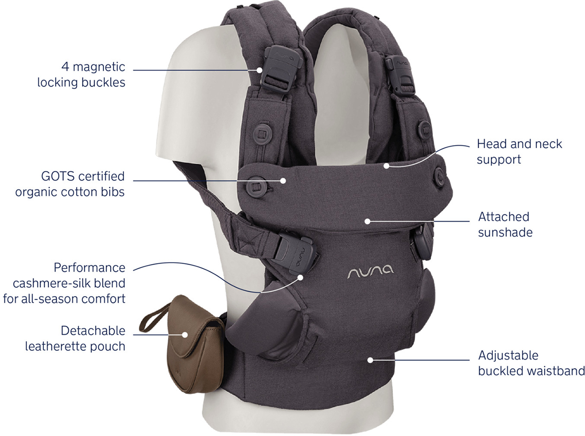 You can't be all things to all people, and that's OK. Because to them, you are the world. You embody all and beyond. Your heartbeat sets the rhythm of their day. Amidst the demands of your day-to-day life, you deserve time for tender moments to nurture what matters most. Because moments are here and gone. The CUDL luxe baby carrier creates those moments for youwhen your breath and theirs are allowed to intertwine effortlessly. Crafted from the finest performance cashmere, it's more than just a baby-wearing accessory. It's a decadent cocoon of comfort that provides a well-deserved opportunity for heartfelt connection. In your arms, they are home. Be uncompromising with your cuddles. Features Structured ergonomic design that ensures comfort for both wearer and baby a stylish aesthetic that becomes a functional and fashionable accessory; Suitable from newborn to toddler up to 35 lbs; Four carry positions provide adaptive positioning as your child grows: newborn mode, facing in, facing out, back carry; Innovative leg openings easily adjust for a customized fit for smaller babies; Machine washable delicate washing cycle for whenever a refresher is needed; MagneTech secure snap is a self-guiding magnetic buckle that automatically locks into place and ensures an easy and secure attachment; Sunshade is self-storing and easily pulls up to protect baby from the elements; All-over comfort from even distribution of baby's weight thanks to padded shoulder and waist straps; Adjustable yoke keeps shoulder straps connected and comfortable; Versatile buckled waistband easily and conveniently secures for custom fitting and adjusts from 24 to 60 for comfortable lumbar support; Newborn ready with an integrated infant booster that features covered locking zippers to ensure soft and safe use with babies under months; Infant booster can be unzipped and completely removed when no longer needed; Head support can fold down or be kept up for comfort as baby grows; Harness covers are included for added softness and comfort; Marked by meticulous attention to detail from indulgent performance cashmere fabric to one-of-a-kind packaging; Perfectly giftable a timeless keepsake box that's been designed to hold baby's most treasured memories; Luxurious performance cashmere-silk blend has a natural moisture-wicking ability that provides all-season comfort with exceptional durability; Leatherette pouch on waistband is removable and features a wristlet strap for all the essentials; Pair of Nuna exclusive recycled cashmere baby socks are tucked inside the keepsake box for keeping tiny toes toasty; Two GOTS certified organic cotton bibs are also conveniently tucked inside the keepsake box; GOTS certification means it is recognized by the world's leading processing standard for textiles made from organic fibers; Included storage bag is perfect for protecting and great for traveling; Mesh laundry bag for washing convenience; Made with performance cashmere that is consciously sourced and produced accordance with the Good Cashmere Standard and is approved by OEKO-TEX STeP, OEKO-TEX 100, and the Sustainable Fibre Alliance (SFA); Our cashmere supplier is a member of the Cashmere and Camel Hair Manufacturers Institute (CCMI), certifying it is sustainably and ethically sourced; Specifications Recommended Use: Facing in/infant booster: 8-15 lbs, < months; Facing in: 15-30 lbs, 4+ months; Facing out: 20-30 lbs, 6+ months; Back carry: 25-35 lbs, 9+ months; Materials: Performace Cashmere Blend: Cashmere 70%, Silk 30%; Plastic buckles; Magnet; What's In The Box CUDL luxe carrier; Pair of GOTS certified bibs; Pair of Harness covers; Pair of recycled cashmere baby socks; Leatherette pouch; Storage bag; Mesh laundry bag;.