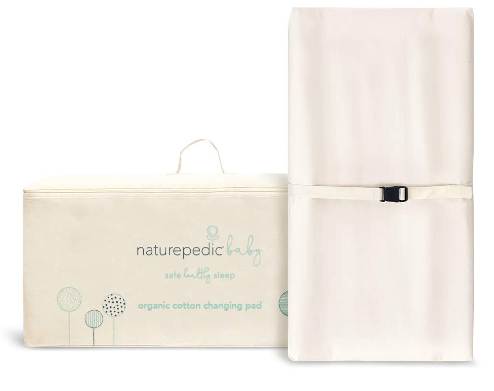 The Naturepedic Organic Cotton 2 Sided Changing Pad is a deluxe contoured pad featuring organic cotton filling and fabrics. It comes with snap-screws to easily secure to any dresser as well as a child safety buckle to help keep the baby in place while changing. A non-toxic waterproof surface made from 100% food-grade polyethylene easily wipes clean with a damp cloth. Meets the strictest GREENGUARD certification standards for eliminating chemical emissions making this pad an excellent choice for parents seeking to remove potentially harmful chemicals from their baby's nursery. Wipe clean waterproof surface so pure it meets food contact standards; 2-Sided contoured design helps keep baby positioned while maximizing space; Safety buckle secures baby while changing; Easy snap-screws secure pad to dresser; Certified organic cotton fabric & filling; Air-Core technology for structural support (100% food-grade polyethylene); Safe hypoallergenic design free from harmful chemicals; Measures 16.5? x 33? x 4?; Made in the U.S.A.;.
