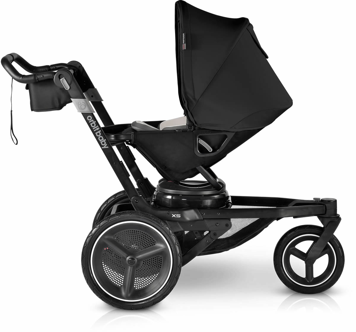 Why We Love It For babies from birth to 50 lbs.; SmartHub base rotates 360-degrees so baby can be forward or parent-facing, upright or reclining; Easy to fold, load, and go; Independent suspension for running or off-road adventuring; Reflective logos & rims for optimal visibility in low light; Nimble maneuverability for trails & city streets; Designed for active families of all levels, the Orbit Baby X5 Jogging Stroller Base easily optimizes for strolling, jogging, speed, or terrain with its premium suspension system and specialized wheel modes. This versatile stroller also features dock-and-go compatibility with all Orbit Baby seats, so from a coffee run to the car to running the trail, it's one stroller for all day, every day. Provides seamless travel from city to car to trails, this jogger features dock-and-go compatibility with the Orbit Baby Stroller Seat (included), Bassinet, Infant Car Seat or Toddler Car Seat. A lockable swivel front wheel offers easy maneuverability or a straight trajectory with stability while jogging, while reflective logos and rims provide optimal visibility in low light. It's easy to fold, load and go and the handlebar easily adjusts height from parent to parent and optimal running comfort, plus sandal-friendly brakes offer easy stopping. The SmartHub base provides 360-degree rotation, so baby can ride forward or parent-facing, upright or reclining. The independent suspension absorbs impact and provides a smooth ride for baby, even when parents are running or off-road adventuring. Perforated rims offer finger and hand safety. X5 Jogging Stroller Features For babies from birth to 50 lbs.; Provides seamless travel from city to car to trails, featuring dock-and-go compatibility with the Orbit Baby Stroller Seat (included), Bassinet, Infant Car Seat (included) or Toddler Car Seat; 360-degree rotation on SmartHub base, so baby can ride forward or parent-facing, upright or reclining; Independent suspension absorbs impact and provides a smooth ride for baby, even when parents are running or off-road adventuring; Perforated rims for finger and hand safety; Versatile, lockable front wheel for easy maneuverability or a straight trajectory with stability while jogging; Reflective logos and rims for optimal visibility in low light; Easy to fold, load, and go (seat must be removed before collapsing); The Orbit Baby X5 Jogging Stroller includes: X5 Stroller Frame; Cupholder and Cargo Basket; Stroller Seat Footrest; G5 Stroller Seat; Detachable Support Bar and Snack Tray; Memory Foam Infant Insert; UPF Sunshade; Shoulder Pads;.