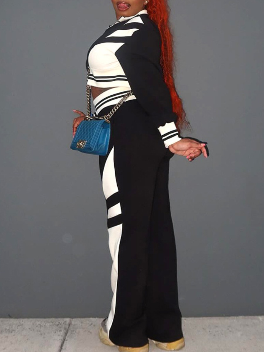 LW Street Polyester Turndown Collar Patchwork Color Contrast Long Sleeve Two-piece Pants Set.