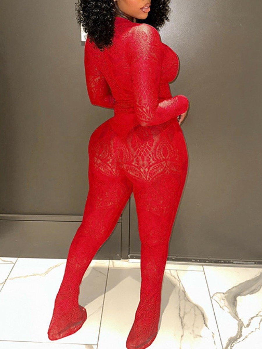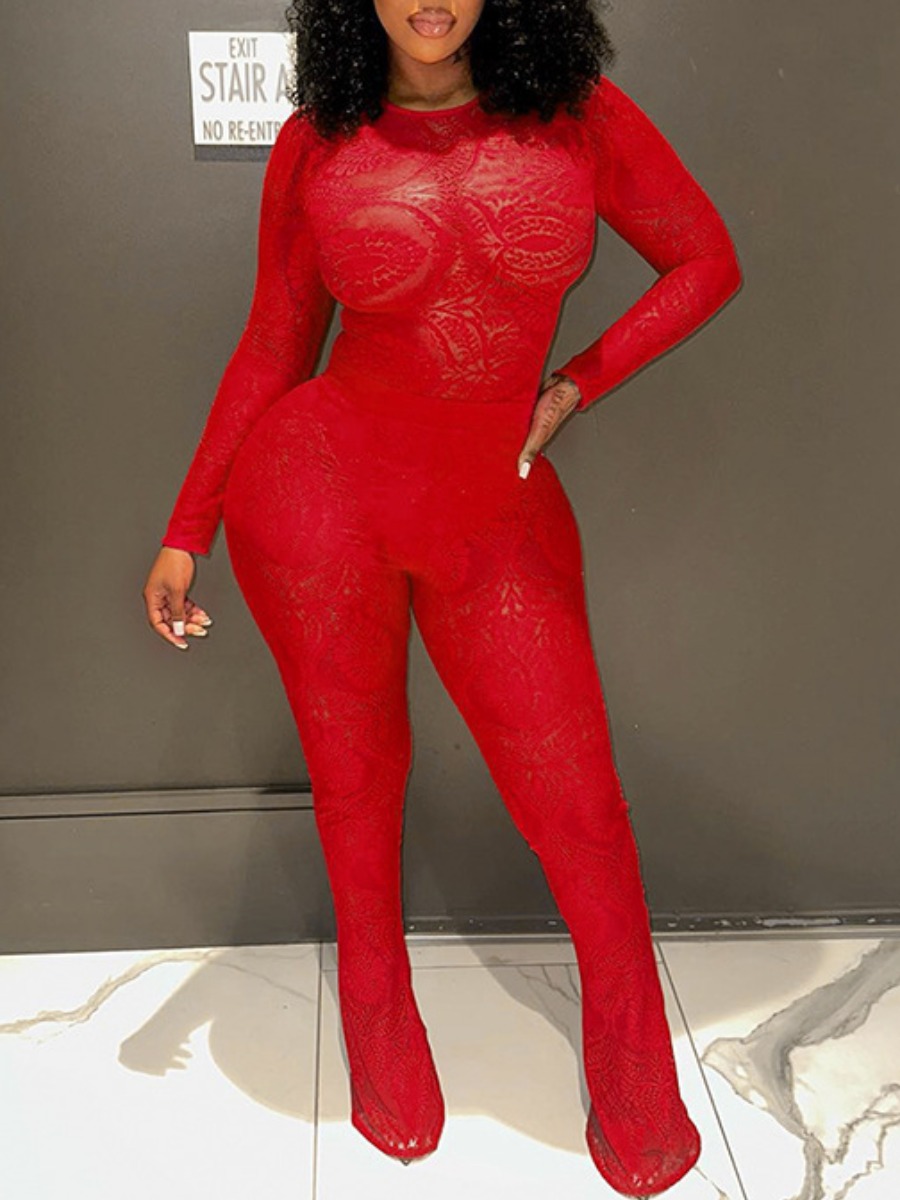 LW SXY Sxy Polyester Round Neck See Through Solid Color Long Sleeve Two-piece Pants Set