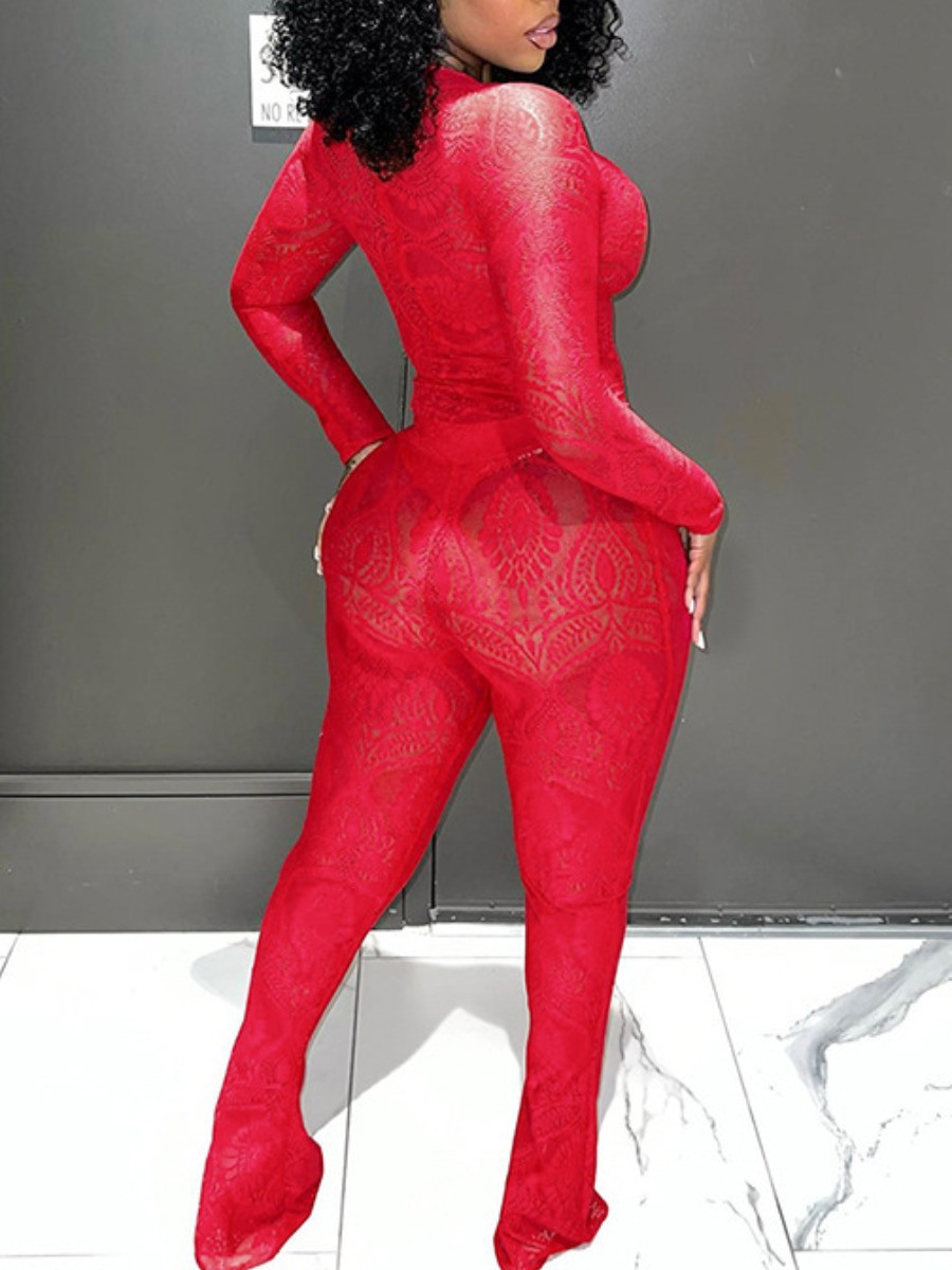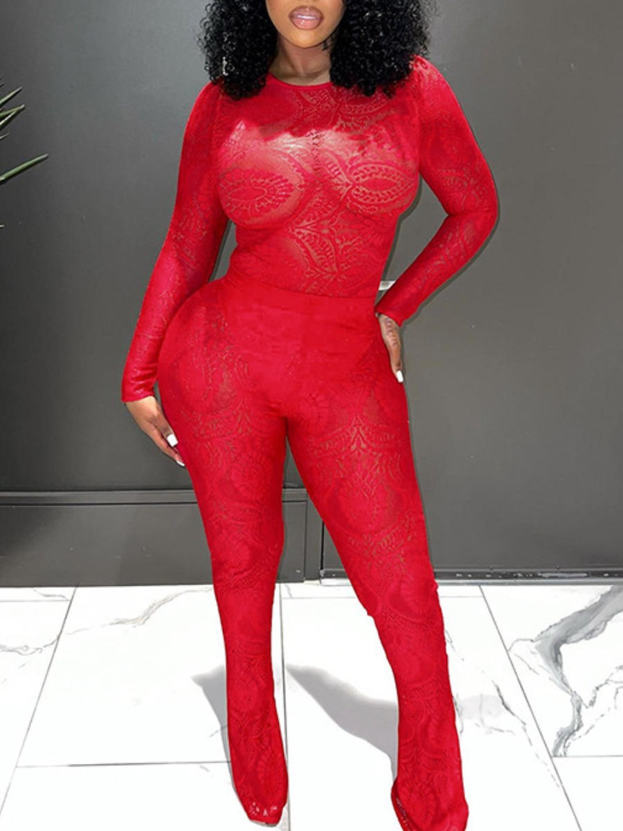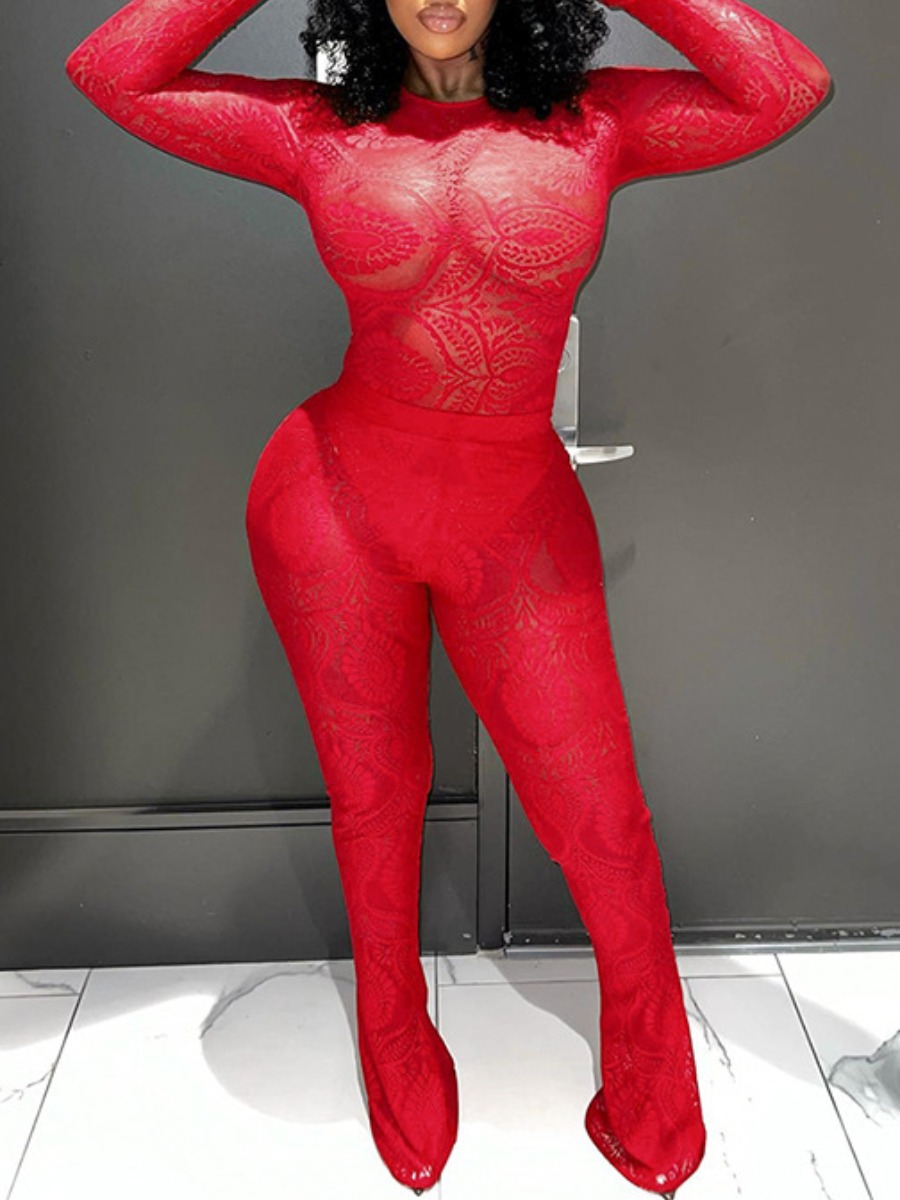 LW SXY Sxy Polyester Round Neck See Through Solid Color Long Sleeve Two-piece Pants Set.