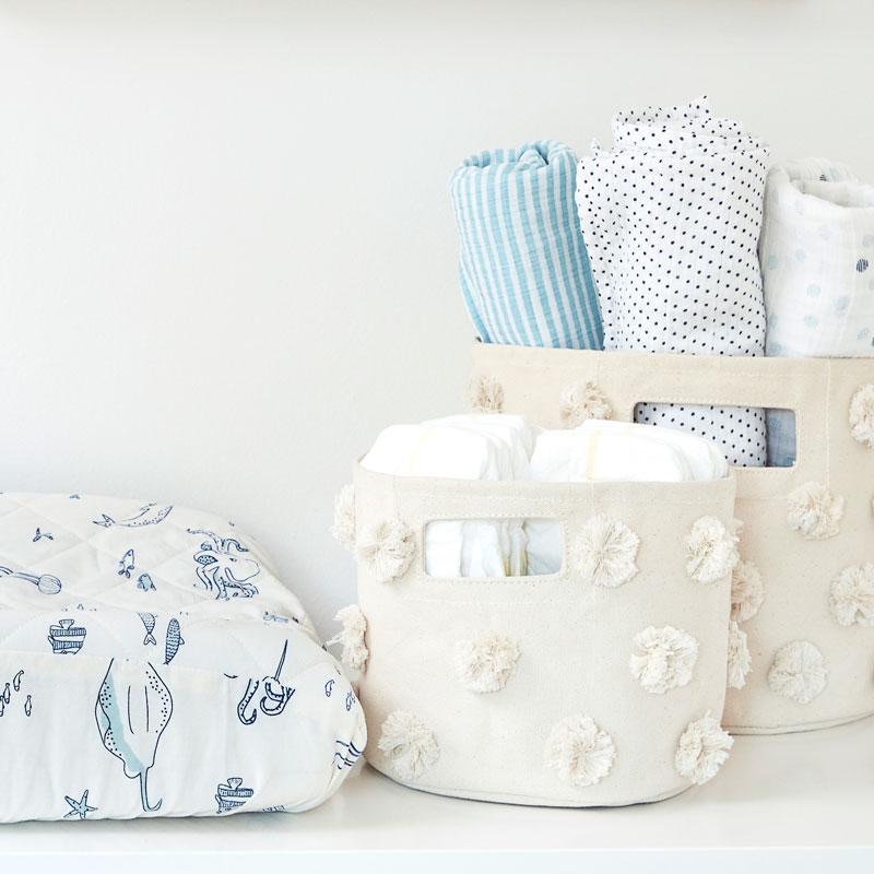 From the nursery, to the kitchen, to the car, this durable cotton-canvas storage Pom Pom Mini is essential for rounding up your little one's bits and bobs, wherever they may be. Ethically Made; Specifications 100% heavyweight durable cotton canvas.; Mini Size: 8"d x 7"h / 20.25 cm x 17.75 cm ; Care Spot clean as needed, do not machine-wash.; For your little one's safety, decorative use only. This is not a toy. Small parts.;.