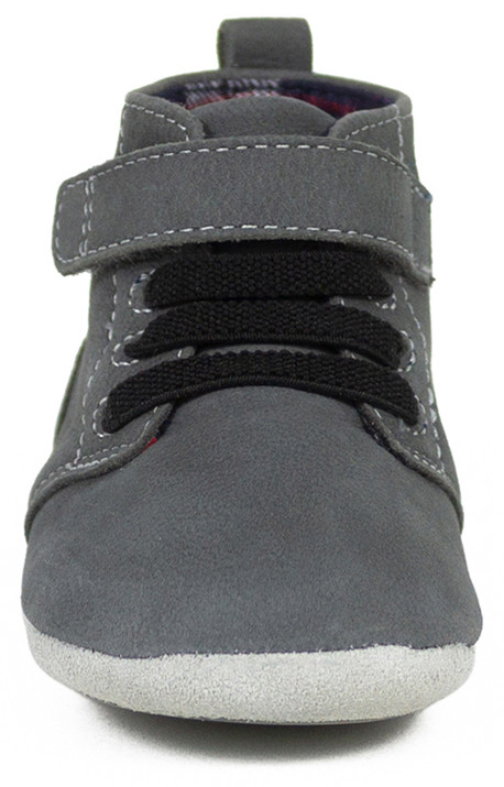 The Thiago First Kicks in Charcoal are introduced just in time for the colder months. Perfect for beginner walkers, the Thiago a classic grey suede baby shoe made with stretchy, faux laces, a velcro strap closure, and split rubber sole. In a nutshell, our Thiago is designed to stay on your baby's feet and assist in gripping the floor as walking becomes more the norm. The plaid lining adds a touch of warmth, too. First Kicks Benefits Approved by the American Podiatric Medical Association.; Structured silhouette looks, feels, and operates like a shoe-perfect for early and beginner walkers.; Sole flexes and bends with every step to allow full range of motion needed for healthy foot development.; Sizes 0-3 & 3-6 Months have a soft, suede sole.; Sizes 6 months and older have a split rubber sole that grips the floor, adds durable traction & helps prevent falls.; Adjustable closures make for easy on & off.; Padded insole provides protection and plenty of cushioning.; Spot clean with a mild detergent and damp cloth.;.