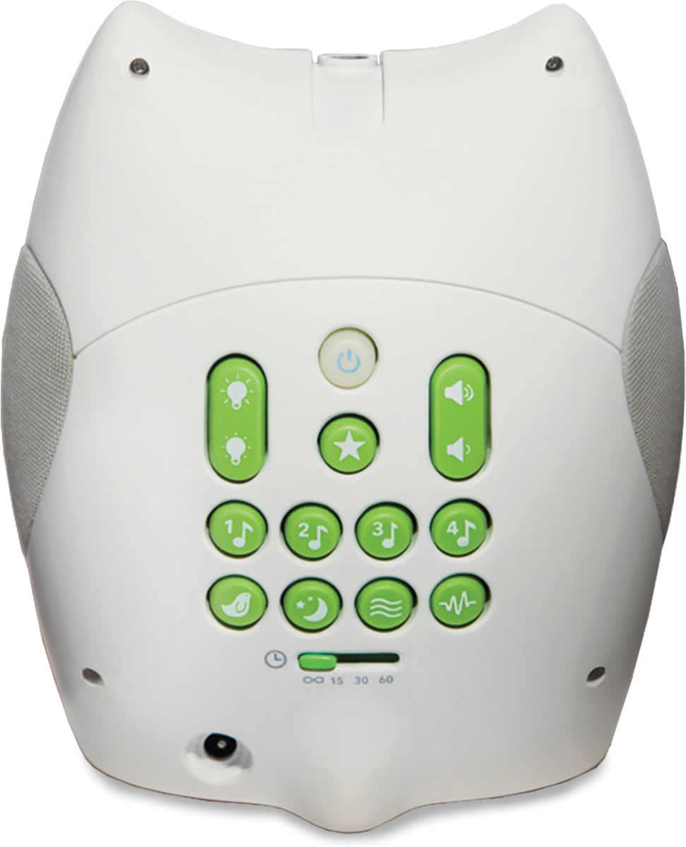 This stylish feathered friend is a natural fit for the modern nursery. Featuring a dimmable nightlight belly that emits a warm glow, it soothes baby with eight gentle melodies and calming nature sounds. An adjustable pivot lens projects a starry nightscape onto any surface so little one can see the luminous sky from his or her favorite sleeping position. Just choose the light and sound combination that's right for your baby and our wise owl will do the rest! Serene stars & moon projection; Glowing nightlight belly with dimmer control; Plays four melodies (Eine kleine Nachtmusik, Twinkle Twinkle Little Star, Brahms'Lullaby, Rock-a-bye Baby and four nature sounds (Rainforest, Jungle crickets, Waves, White noise with heartbeat); Choose any combination of lights and sounds; Auto-off timer sets for 15, 30, 60 minutes or continuous play; Plugs into any standard outlet; Volume control; Size (inches): 5.5l x 4.5w x 6h;.