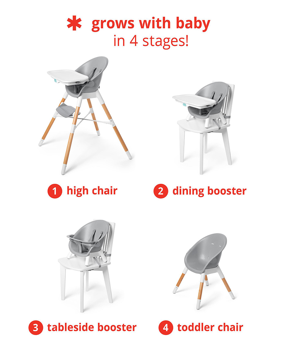 From baby to big kid, our modern 4-in-1 high chair adapts to your child's stage and age for years of use. Sleek and space-saving, the innovative design can be used four ways: high chair, dining booster, tableside booster and finally a big kid chair. Smooth wipe-clean surfaces, a detachable tray and more user-friendly features make this a mealtime must-have with multiple options. Features: 4 ways to use: High Chair, Dining Booster, Tableside Booster, Big Kid Chair; Smooth, wipe-clean surfaces; Detachable & adjustable tray with dishwasher-safe insert; Removable 5-point harness; 2-position footrest; Modern, space-saving design with beechwood accents; Ages: High chair: 6m-3y (up to 33 lbs/15 kg); Booster seat: 6m+ (with harness); Big kid chair: up to 5 years (supports up to 80 lbs/36 kg); High Chair size (inches): 26.4L x 27.4D x 36H; (cm): 67L x 69.5D x 91.4H; Booster Seat size (inches): 16.8L x 13.8D x 16H; (cm): 42.6L x 35D x 40.6H; Big Kid Chair size (inches): 18.9L x 17.5D x 24H; (cm): 48L x 44.4D x 61H; Fabric & Care: Tray, seat & harness straps: wipe clean with damp sponge or cloth; Tray liner: Dishwasher-safe or wipe clean;.