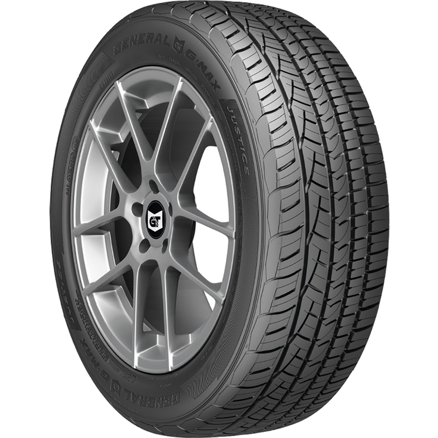 General G-MAX Justice. FEATURES AND BENEFITS: All weather traction; High speed controllability; Longer lasting tread life; . OVERVIEW: The General G-MAX Justice is a performance and high performance, depending on the speed rating, all season tire manufactured for passenger vehicles. The model was designed for law enforcement vehicles and high-speed pursuit applications.The model offers excellent all weather traction. The all season tire compound and the asymmetric tread pattern increase the dry, wet and winter weather traction. The all season compound maintains its rubber flexibility throughout the year, even in colder temperatures. The asymmetric tread's optimal tread element placement increases the year round grip thanks to the biting edges of the numerous notches and the siping detail. The special circumferential and high void angled lateral grooves avoid hydroplaning. They disperse water and slush from below the tire's footprint. This combination ensures a safer year round driving experience.The tire's high speed controllability is upgraded with the constant road contact. The improved and maintained road contact increases the steering responsiveness and the driving stability. In other words, it stabilizes the structure against the driving pressure affecting it, while the steering response to the driver's instructions becomes faster and more precise. The larger outer shoulder tread area heightens the number of biting edges, which grip the road surface during cornering, to improve the maneuvering capability. The optimal asymmetric tread design boosts the tire's road contact and heat build-up prevention, which upgrades the high speed driving durability and experience.The G-MAX Justice promotes a lengthened tread life. The StabiliTread technology decreases the possibility of irregular tread wear with the optimal flat footprint and maximized road contact it offers. This enhancement enables the tire to maintain a constant road contact, which evenly distributes the driving pressure along the tread area. The equally spread out forces of acceleration, cornering and braking avoid uneven tread wear and extend the tread life and usability. Manufacturers recommend changing tires every 10 years. As long as tires are properly stored before they are sold, the year of their manufacture will not shorten their service life.