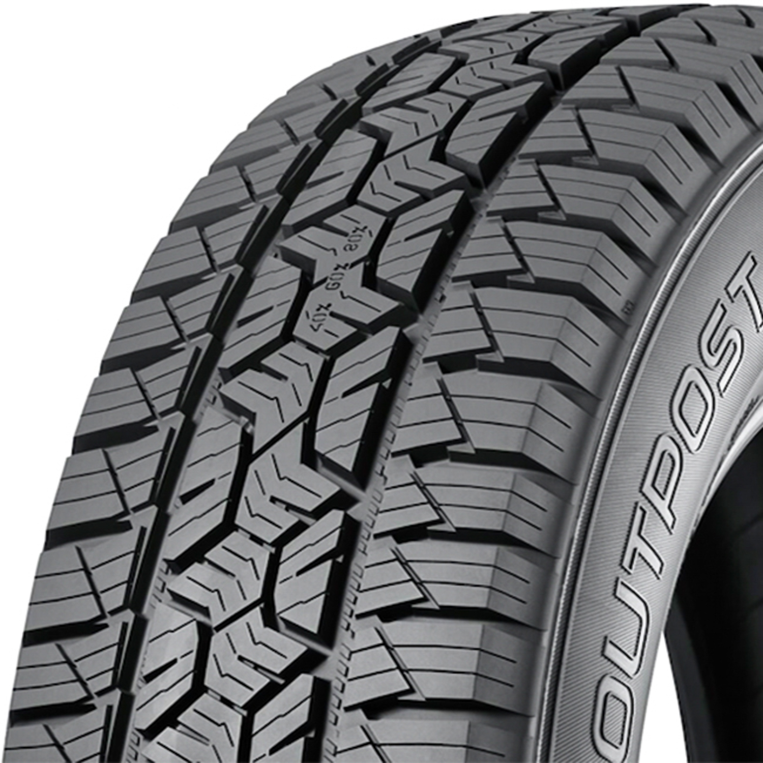Nokian Outpost APT. FEATURES AND BENEFITS: All season traction; Enhanced controllability; All terrain traction; Tread wear indicators; . OVERVIEW: The Nokian Outpost APT is an all terrain, all season tire manufactured for SUVs.This model promotes great all season traction. The stabilized footprint, with the ideal block and sipe placement, and the all season compound work together to boost the model's year-round performance. They firmly grip the road surface at all times, enhancing its dry, wet, and winter grip. Stronger rubber materials keep the tire pliable throughout the year, optimizing the tire's summer and winter weather applications. Hydroplaning is avoided during the tire's on-road drive, as the groove placement disperses water and slush from the footprint.The tread pattern's consistent surface contact increases its controllability. As a result, the tire manages to significantly increase its steering responsiveness and driving stability. This promotes the driver's control of the vehicle during its versatile terrain applications. The reinforced internal structure is strengthened with the Aramid Touch Shield, which does not allow the tire to deform. This increases the tire's load and driving durability, promoting a safer driving experience.All terrain traction is also offered with this model. The staggered blocks and wide grooves enhance the tire's soft, loose, and uneven terrain grip and on-road traction. These tread elements allow the tire to boost its forward motion on versatile terrains, enabling the tire's overall performance. Its self-cleaning ability eliminates mud, snow, and rocks from the footprint. Mud and snow do not block the surface contact, while stone retention is effectively avoided as well. This combination guarantees the tire's versatile terrain application.The Nokian Outpost APT also features tread wear indicators along the tread area. The center rib features numbers which represent the tread life length remaining on the tire in percentages. This allows the driver to follow the tread wear of the tires, minimizing the possibility of worn-out tires being used. Manufacturers recommend changing tires every 10 years. As long as tires are properly stored before they are sold, the year of their manufacture will not shorten their service life.