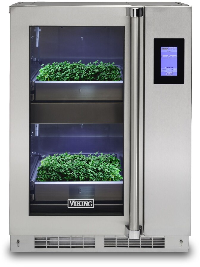 24" Built-In Undercounter Micro Green and Herb Growing Refrigerator with 2 Standard Removable Growing Trays, 2 Propagation Domes, T5 Super Sprouter Fluorescent Growing Lights, 3.25 Gallon Water Reservoir, Digital Touch Screen Controls, Double Wall Stainless Steel Construction, Double Pane Tempered Glass Window, Automatic Filtered Pump and Flow System. Ideal for growing herbs and micro greens. Replicate the suns rays; adjustable lighting cycles. With fully automated ebb and flow irrigation. Dosing pump to regulate pH. Automated system provides correct measures of water, nutrients, relative humidity and lighting; includes a large seed menu so you can change seeds and set your favorites. Preprogrammed for most growing needs. Delivers water and nutrients to the plants. With 3/8 NPT fill and drain connections; water level sensor. Circulation fans to regulate temperature and humidity. On easy gliding rollers with drainage holes in rear for ebb and flow irrigation. For easy viewing; integrated door gasket and full length door handle. With 2.5 adjustable leveling bolts. Two 4 high propagation domes and two mats are included. *Plumbing Requirement: 3/8" NPT drain and fill connections; incoming water must be potable; filtered water recommended, especially in areas where water is very hard or very soft. Unit to be installed with adequate backflow protection to comply with all ap. Volts: 120. Amps: 1.6. Frequency: 60 Hz. 2 Year Full: Complete Product. 90 Day Full: Cosmetic Parts (such as glass, paint- ed items and decorative items). Overall Width: 23 7/8". Overall Height: 33 1/2. Overall Depth: 27 7/16". Weight: 150 lbs.