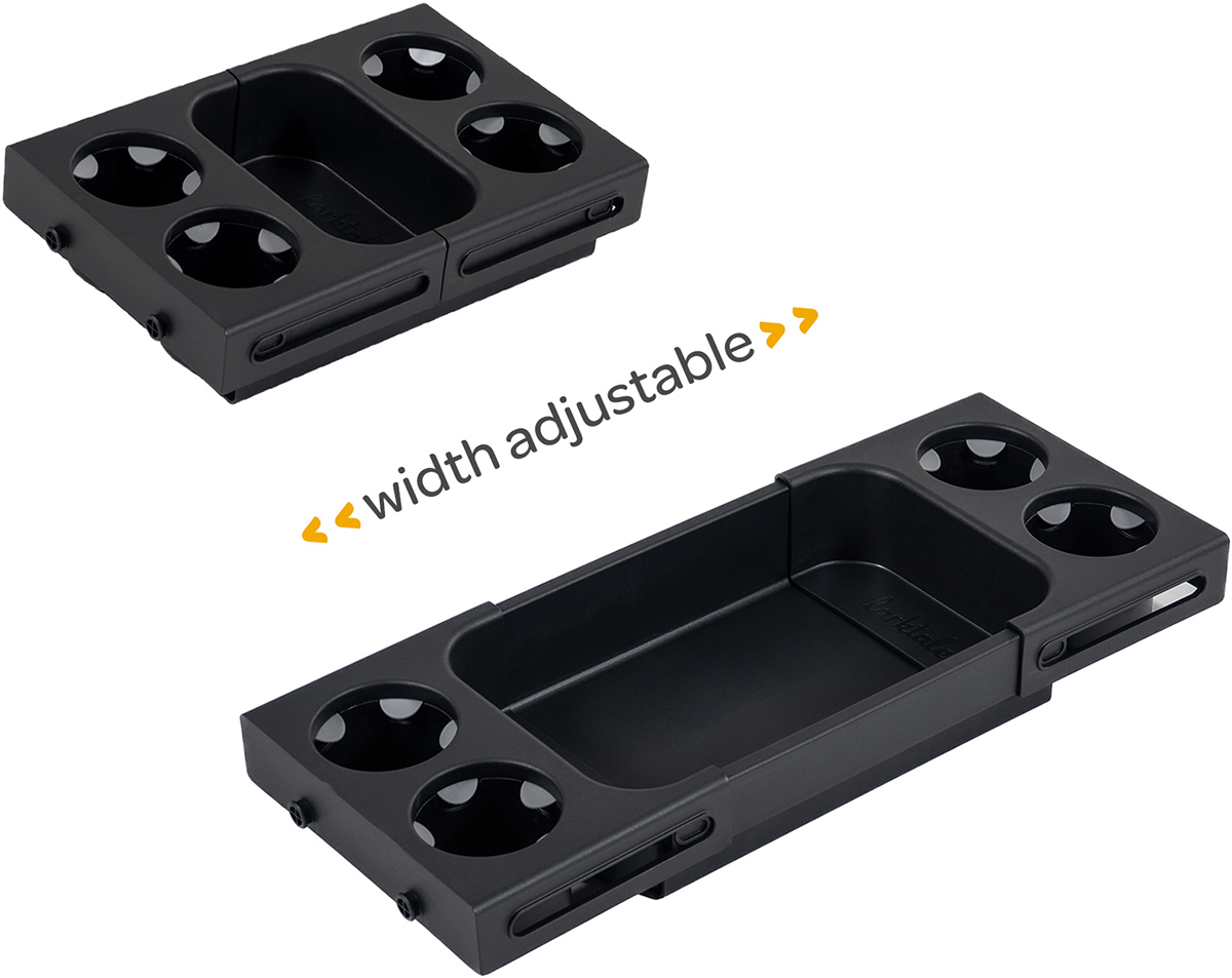 The Larktale Stroller/Wagon Snack Tray is both height and width adjustable to fit most double seater and quad wagons currently in the market. Our mounting clips attach easily to both straight frame and X frame wagons and provide three different height options to grow along with your children. This universal Snack Tray features four grippy cup holders and a large middle tray area that expands to fit the width of your stroller/wagon. Looking for a flat tabletop? Simply flip the tray over and the Snack Tray's flat base will provide a smooth surface, perfect for drawing or other extra activities on the go. Fits most wagons with a 15-23 inch interior width. Measure the interior width of your stroller/wagon to determine fit and be aware of any bulky frame components like canopy brackets or handles that may block the Snack Tray from properly attaching. Technical Specs: Usage Range: Fits most 15 - 23 inch stroller/wagon interiors*; Wagon Style: Fits most X-style frame or straight frame stroller/wagons; How to Fold: Remove snack tray and brackets before folding; Weight Capacity: 5.5 lbs; Cleaning: Spot clean using a mild cleanser and a damp cloth;.