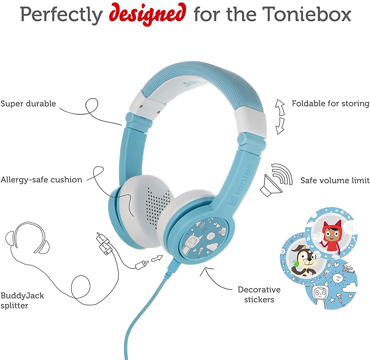 Meet the Tonies Headphones! These foldable, durable, kid-safe, volume-limiting headphones come in six colors to match your Toniebox. Each headphone set includes a matching sticker set and a detachable audio cable with a BuddyJack splitter for sharing storytime with up to four sets of headphones from a single Toniebox. Details: Impedance: 32 Ohm; Frequency Response: 20-20,000 Hz; Plug: 3.5mm; Weight: 120g; Sensitivity: 85dB +/- 3dB; Driver unit: 30mm; Cord length: 1.2m; Recommended for ages 3+; Made of sustainable fabric; WARNING! Not suitable for children under 36 months. Choking hazard. Small parts.