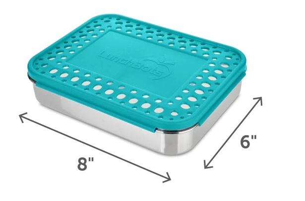This spacious, 3-compartment stainless steel bento box is designed to fit a full sandwich and two sides. Sandwich fans of all ages love the Trio because this single container has plenty of room to fit an entire lunch. Details 3-compartment bento box designed to hold a sandwich and two sides.; 100% stainless steel interior, including the lid. No plastic touches your food.; Add a pop of color with an optional snap-on, plastic Dots cover.; Dishwasher safe for an easy clean up.; This product is not leak proof. We recommend packing dry foods only.; Specifications Dimensions: Container: 8" x 6" x 1.75" | section: 5" x 6" | Square sections: 3" x 3"; Capacity: 32 fl. oz. | 940 ml; Weight: 16 oz.; Material: 18/8 food-grade stainless steel; Care: Dishwasher safe. The optional Dots cover can be washed while attached to the lid.;.