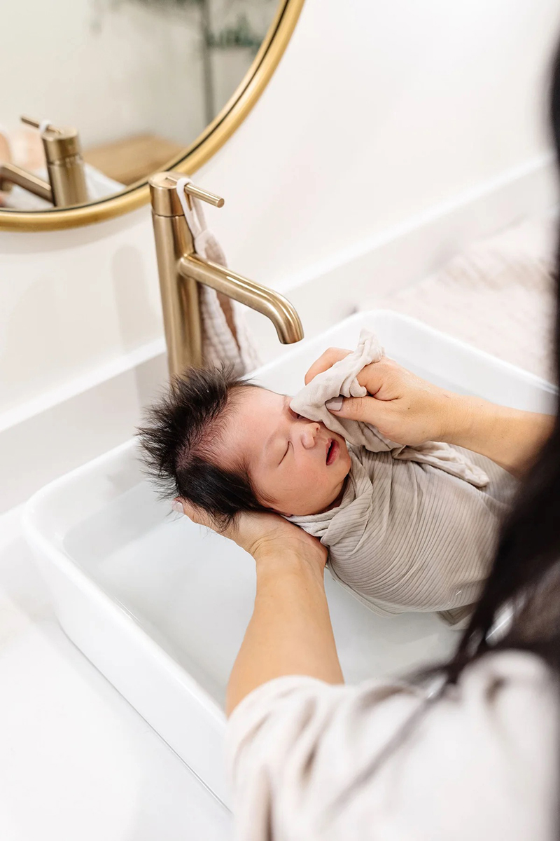 Let's be honest, bathing a newborn can be a little intimidating! While working as a NICU nurse, I learned the swaddle bath technique, which is a way to bathe your baby while keeping them calm and happy. Watch the attached tutorial to see how you can use the swaddle bath method with your baby! This swaddle bath blanket is the ideal size and weight for bathing your infant. Plus the thoughtful loop one one corner makes hang drying a breeze! Made from our stretchy, silky soft custom fabric; Perfectly sized at 28 x 28 inches; Hanging loop makes drying easy!; After you are done doing swaddle baths you can use this blankets as a lovey and attach it to pacifiers and teether for your little one!.
