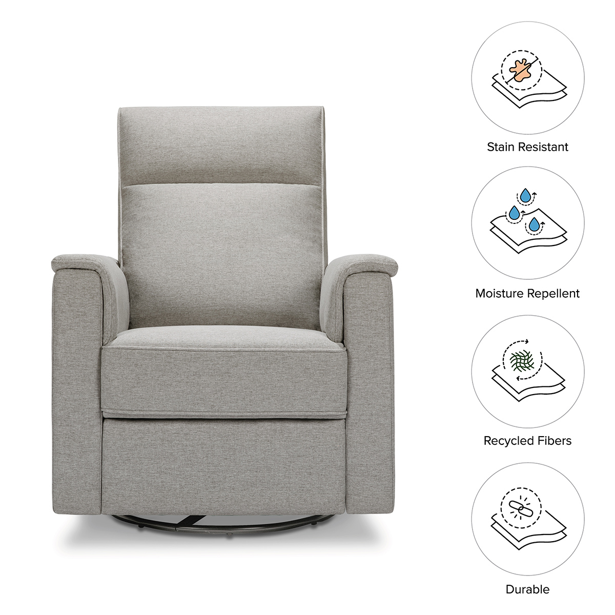 With thoughtful details and clean lines, the Willa Recliner combines modern design with traditional comfort. Its pillow lined arms and durable fabric create the perfect environment to bond with your baby, and its gentle swivel and glide are sure to help you relax. Features GREENGUARD GOLD CERTIFIED: This product has been tested for over 10,000 chemical emissions and VOCs, undergoing rigorous scientific testing to meet some of the world's most stringent chemical emissions requirements. It contributes to cleaner indoor air to ensure the health and safety of your family and home.; WATER REPELLENT & STAIN RESISTANT FABRIC: Sit back and relax knowing our performance fabric will help keep your glider safe from spills and stains.; ECO-PERFORMANCE FABRIC: You can feel good about making a more sustainable choice. At least 40 recycled plastic bottles were used in the making of this soft and durable eco-performance fabric utilizing LiveSmart performance fabric + 30% REPREVE recycled yarn.; EASY RECLINE & EFFORTLESS GLIDE: Cuddle up, recline, and get cozy. Our hidden reclining mechanism maintains a clean design while offering traditional comfort. Whether you are feeding baby or rocking baby to sleep, our metal base allows for a smooth and gentle 360 degree swivel motion as well as forward and backward gliding. (Gliding Ottoman #M17285 sold separately); HIGH BACK: Lay back and rest your head with ease. Our high back gives you the neck support to lean back and recline comfortably.; COMFORTABLE & DURABLE: This recliner features pillow lined arms and is upholstered in a durable polyester fabric for extra comfort.; BREATHE EASY: Foam used in the seat meets all CA TB117-2013 flammability requirements and is CertiPUR-US certified, certifying the foam is made without PBDE or Tris flame retardants, heavy metals, formaldehyde, CFCs and phthalates regulated by the CPSC.; FSC CERTIFIED WOOD: Wood used in the frame of this product comes from well-managed,_FSC-certified forests. The FSC label means that wood has been harvested to benefit communities, wildlife, and the environment.; EAST SET UP: 1-step assembly - no tools required.; Specifications Made in ChinaDIMENSIONSAssembled Dimensions: 38"L x 31.50"W x 41"HAssembled Weight: 99lbsSeat Dimensions: 21.5"D x 19.75"WSeat Height: 21"HArm Rest to Seat Height: 7.5"Seat Back Height: 26"Fully Reclined Length 67"MAXIMUM WEIGHT300 lbs.