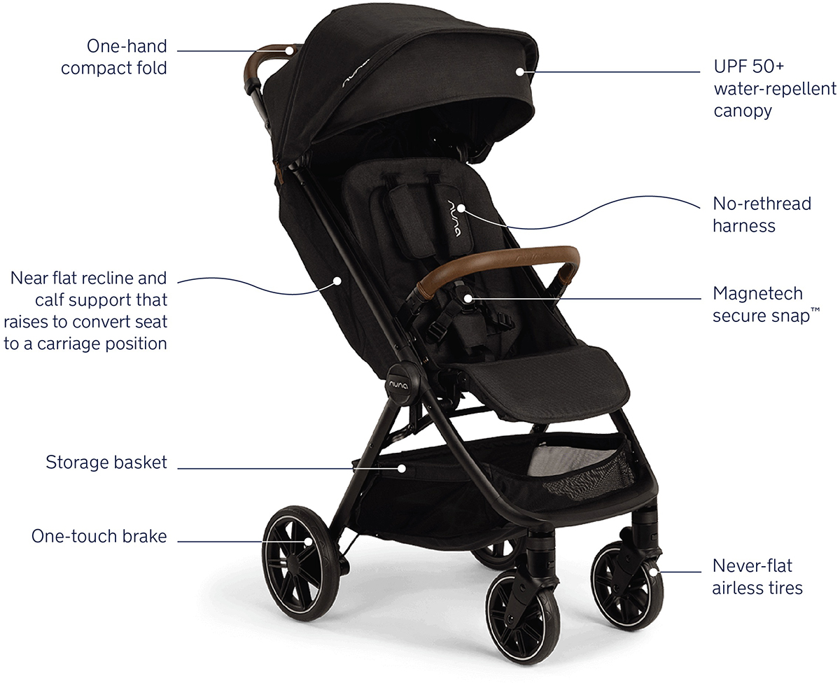 With baby as your co-captain, every moment, no matter how ordinary, has the potential to be made extraordinary. A fresh perspective on day-to-day outings with your little one starts now. The TRVL lx stroller presents you with the compact freedom you need to get out and about, regardless of how near or far the journey leads. It's designed to never weigh you down and has a one-handed fold that redefines what you've previously known about moving through your day with grace and ease. With its leveled-up wheel profile, you're ready to navigate whatever the road ahead has in store. The TRVL lx is an invitation to add luxury to your daily adventures and turn every stroll into a celebration. Features Use In it for the long haul providing smooth strolls from birth to 50 lbs; Near flat recline and calf support that raises to convert seat to a carriage position for keeping baby extra cozy; Creates a sleek-looking travel system connecting directly with Nuna PIPA series car seats with just a click-no adapters needed; Folds easily with one hand and stands on its own when folded; Ultra-lightweight and easy to tote with carry bag or armbar when folded; One-handed steering and exceptional maneuverability make it a dream to push and turn; Front swivel wheels with swivel locks for more comfortable strolls on uneven terrain; Quick-release wheels make for an even more compact fold; Safety Simple one-touch rear-wheel braking system; The 3 to 5-point no-rethread harness makes it easy to fasten them in; Comfort Shadow reel recline provides one-handed, customizable recline adjustments with more upright options; MagneTech secure snap is a self-guiding magnetic buckle that automatically locks into place; Water-repellent UPF 50+ canopy is easy to clean and provides premium coverage and multiple windows; Canopy extends and features airy mesh panels to provide extra comfort for sunny days and warm temps; Progressive front and rear-wheel suspension technology provides a smooth ride; Removable and rotating armbar fits kids of all sizes; A 2-position adjustable calf support for growing legs; Premium details Go hands-free and store away during travel with the included carry bag; Luxe leatherette accented pushbar and armbar lend style to your strolls; Never-flat airless tires are ready to go for miles; Easy access shopping basket holds everything you need for the journey; Specifications Usage: Up to 50 lbs; Dimensions: 45.5 x 32 x 21 in; Folded dimensions: 27 x 14.25 x 21 in; Weight: 14.6 lbs *without canopy and armbar (canopy and arm bar weigh approx. 2.4 lbs); Care Easy to clean fabric Lay flat; Air dry, do not tumble dry; Do not iron or dry clean; Do not use abrasives or bleach; Frame and plastic parts Wipe with a damp cloth; Air dry; Wheels Rinse regularly with water; PIPA Aire RX Infant Car Seat Lighten your load and up your style game. That's the PIPA aire rx motto. Whether it's the sleek design elements or the smart security features that catch your eye, the PIPA aire rx car seat is all about hassle-free adventures with all the perks. Light on weight, heavy on style, it's your go-anywhere, do-anything partner that's in it for the long haul. In the world of PIPA aire rx, casual meets cool, and carrying less is the ultimate flex. Now, you can carry less, do more, and look good doing it. Your refined taste for baby adventures deserves an equal match. Features PIPA aire rx The PIPA aire rx is lightweight with zero compromises; A lightweight full-featured infant car seat; Ideal for city living and taxis as it can be installed with a vehicle seat belt and no base; Integrated magnetic buckle holders keep straps out of the way when buckling baby in; Fabrics and inserts are conveniently machine washable; FAA certified for aircraft use with or without a base; Connects with all Nuna strollers to create a stylish travel system*; 5-second steel-reinforced True lock installation makes set up swift, simple, and safe**; Side Impact Protection (SIP) for ultimate baby safekeeping; Open belt path with lock off secures lap and shoulder belt; Features Aeroflex foam that is cleverly lightweight, resilient, and minimizes force transferred to baby; 3-position height-adjustable headrest and 5-point harness keeps little ones in place; Removable infant head and body inserts nestle baby in comfort and security; Tailor tech memory foam seat panel and headrest provides a comfortable custom fit; UPF 50+ canopy with 2 positions and a flip-out eyeshade protects from sun exposure; The iconic Sky drape provides baby with ultimate privacy for quiet moments; Soft yet durable micro-knit fabric for refined style and casual warmth; Super-resilient top-of-the-line plastics for a heavy-duty secure shell; Exposed aerospace aluminum handle adds a contemporary aesthetic and enhances the seat's intuitive functionality; Luxe leatherette carry handle for more secu.