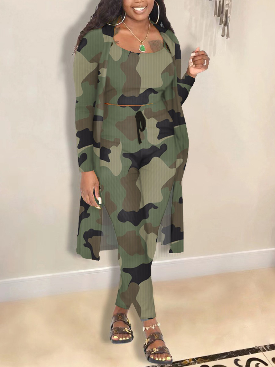 LW Plus Size Crop Top Camo Print Rib Knit Three Piece Pants Set