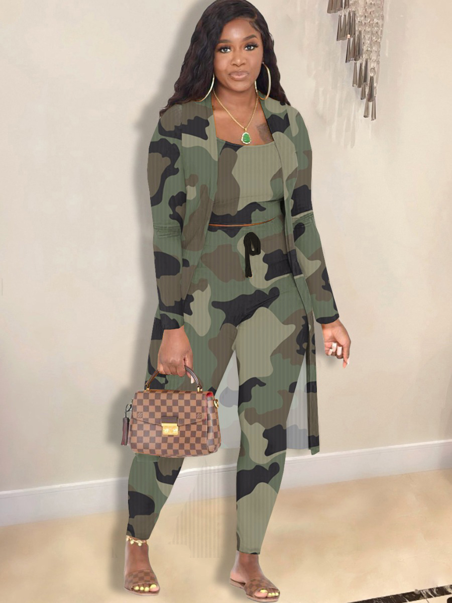LW Plus Size Crop Top Camo Print Rib Knit Three Piece Pants Set.