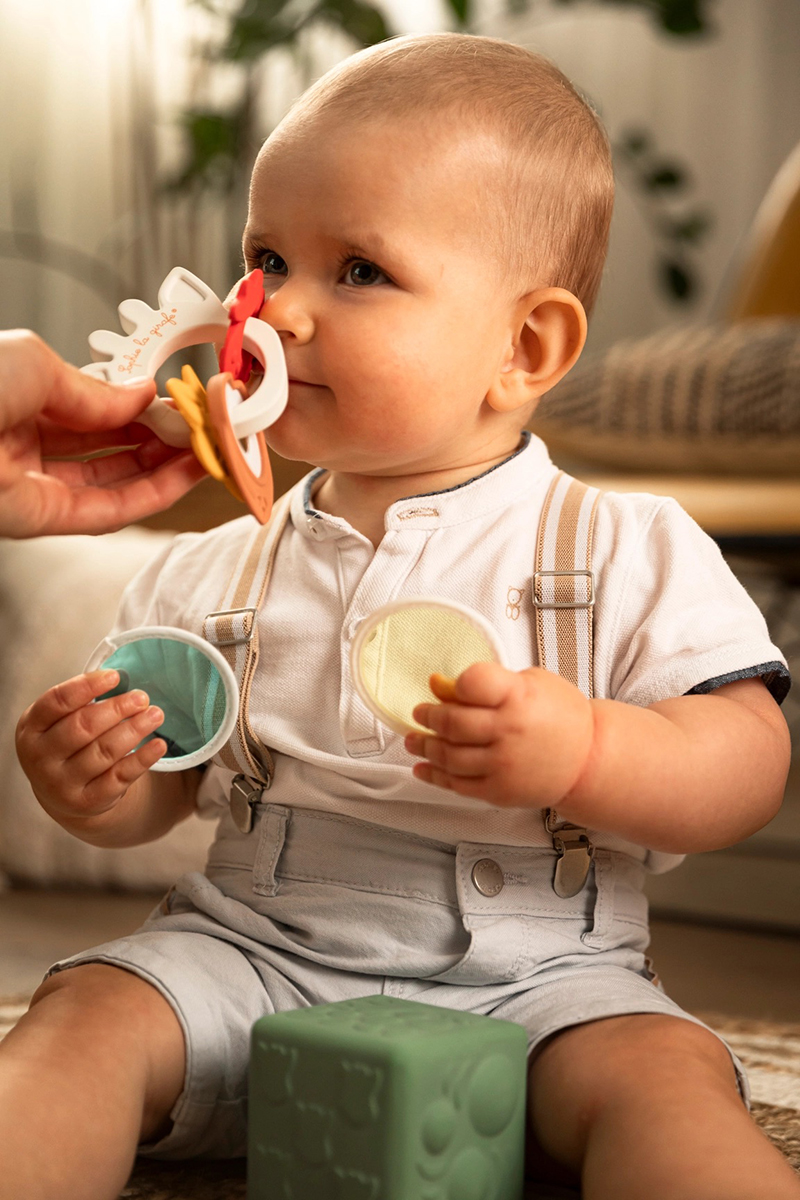 Babies stimulate their sense of smell thanks to the lightly scented natural rubber! It has a main ring with the sweet smell of natural rubber and 3 fruit medallions gently scented with vanilla, strawberry and coconut.