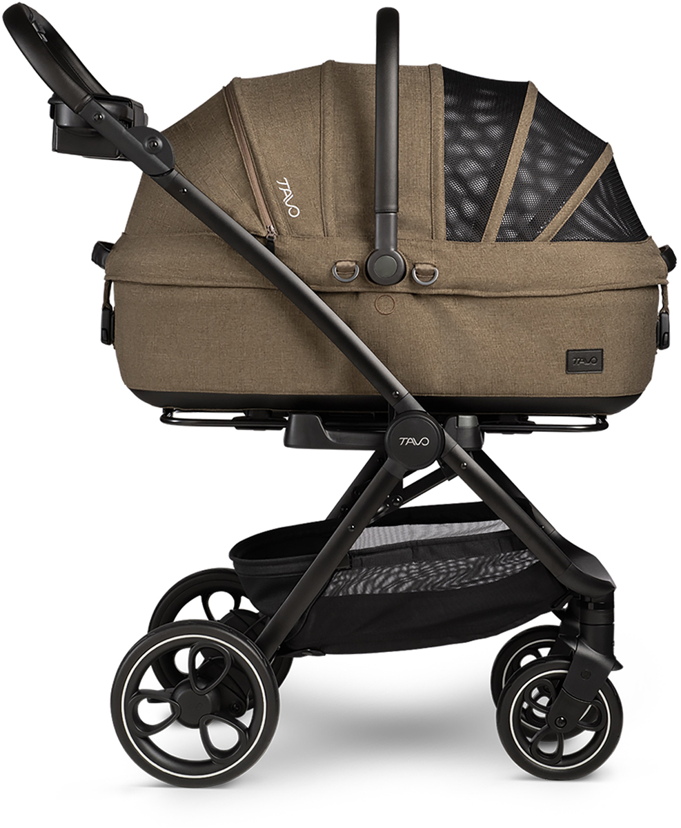 Give your life, and theirs, an upgrade. Stylish, protective, and super-portable, the Maeve 3-in-1 Pet Protection System elevates errands, amplifies adventures, and provides pets and their parents with quiet comfort and peace of mind. Tavo's Maeve Pet Protection System comes with a cozy bed and carrier that connects quickly to the included vehicle base with stability leg and to our premium Roscoe stroller frame-taking your pet's adventures inside and outside the vehicle to the next level. So, whatever the species, age, or stage of your sweet sidekick, we have you covered. Now you can unleash all that love. It's the game-changing pet protection system you never knew you needed but your pet did all along. It's together time upgraded. Your pet will thank you for it. Features Includes Maeve Rigid Pet Car Seat, Vehicle Base & Roscoe Stroller Frame Maeve Rigid Pet Car Seat Suitable for a pet up to 30 lbs.; Cushioned rigid carry handle wrapped in luxe vegan leather.; Exterior zippered pocket_for on-the-go essentials.; Expertly engineered for safety Lightweight yet durable EPP foam surrounds your pet, absorbs energy, and disperses impact.; A unique guard featuring Tailor tech memory foam that absorbs energy and offers Side Impact Protection (SIP) secures easily onto the carrier frame.; MagneTech secure snap buckles quickly secure the canopy and provide frustration free access.; Your pet's ultimate comfort zone Designed to provide a home-away-from-home which can reduce anxiety.; Spacious pod and structural canopy create a cozy area that your pet will look forward to curling up in.; Flexible mesh ventilation panels on canopy allow for airflow and a view to the world for your pet.; Peek-a-boo window_for checking in and seeing out.; Canopy opens on either side and is easily removed for the ultimate customized space.; Mindfully curated premium materials Our fabrics are naturally flame-resistant, free of harmful fire-retardant chemicals, making them safer for your pet._; Canopy fabric is UPF 50+, the maximum sun protective rating achievable for fabrics.; Includes two liner and mattress cover sets that easily zip on and off and are machine washable, air dry.; One standard set - A durable fabric that matches the exterior color of your carrier.; One comfort set - A plush material treated with an eco-friendly, zinc-based technology that provides antimicrobial protection and guards against odor causing bacteria.; Includes two padded mattresses which are easy to rinse and wipe clean.; Premium vegan leather accents for a luxe touch.; Thoughtfully designed details Rubberized feet minimize movement as your pet jumps in and out at home.; 2 leashes of different lengths to keep your pet connected when strolling with an open canopy.; High-strength alloy leash attachments available on both sides of the carrier interior.; Converts simply to a stroller with the included Roscoe pet stroller frame.; Maeve Base Five-second True lock installation; Base attaches to the vehicle's rigid latch anchor bars for a secure, simple installation.; Colored indicators turn green to provide clear confirmation when locked into the vehicle seat.; Stability leg adjusts to the height of your vehicle seats, and an indicator turns green when properly engaged.; Engineered for Safety An energy-absorbing load leg extends from the front of the base to the vehicle floor.; In the event of impact, the stability leg decreases rotation and reduces movement of the carrier.; How to Use Maeve simply clicks down onto the base, and colored indicators confirm a locked connection.; Easily adjustable base positioning adapts to the depth of your vehicle seats.; A smartly located carrier release button makes for easy transfer from car to stroller or home.; Roscoe Stroller Frame Ultimate smooth maneuverability; Multi-terrain suspension accommodates bumps wherever your stroll takes you.; Expertly engineered frame is strong and stable around every bend in the road.; Puncture-proof, lightweight EVA tires provide a softer ride.; Front-wheel swivel-lock for easier navigation over rough paths.; One-touch braking system with a top tap saves your shoes and toes.; One-hand, self-collapsing compact fold With the touch of a button on the pushbar, the frame easily folds down into a compact package.; Convenient built-in rigid carry handle for easy transporting when folded.; Stands when folded for free hands and easy storage.; A place for everything Built-in organizer on the pushbar includes cup holder, phone slot, and compartment with secure magnetic closure to keep everything from your keys to their treats in reach during the journey.; A strong and roomy bottom basket holds up to 10 lbs.; Mindfully curated premium materials Durable matte-black frame is lightweight and thoughtfully designed with sleek lines.; Premium vegan leather detailing provides a luxe touch for your.