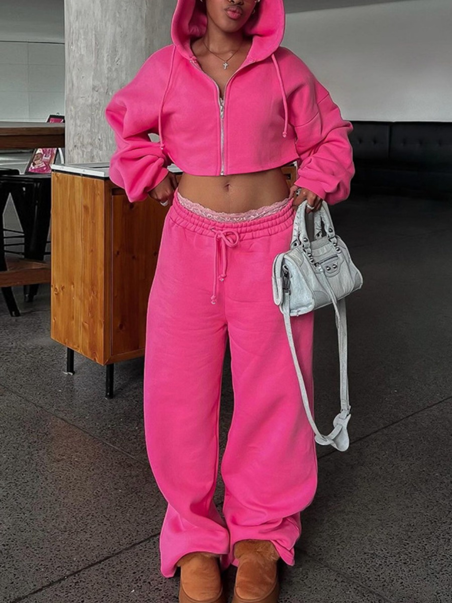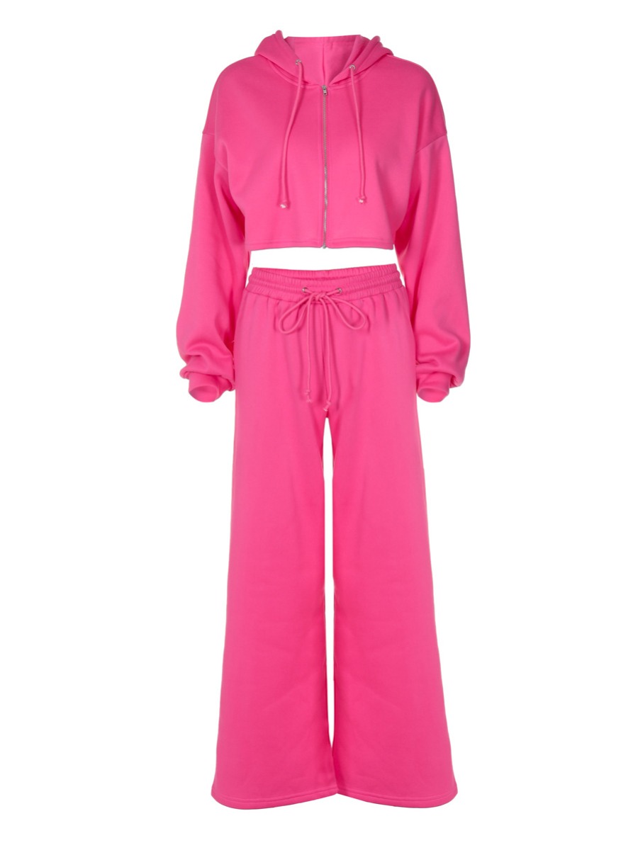 LW BASICS Casual Polyester Hooded Collar Zipper Design Solid Color Long Sleeve Two-piece Pants Set.