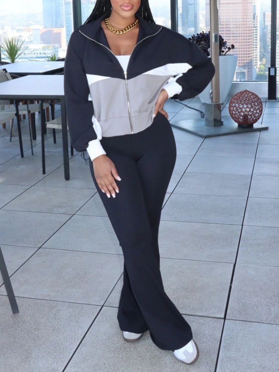 LW Casual Polyester Turndown Collar Zipper Design Color Contrast Long Sleeve Two-piece Pants Set.