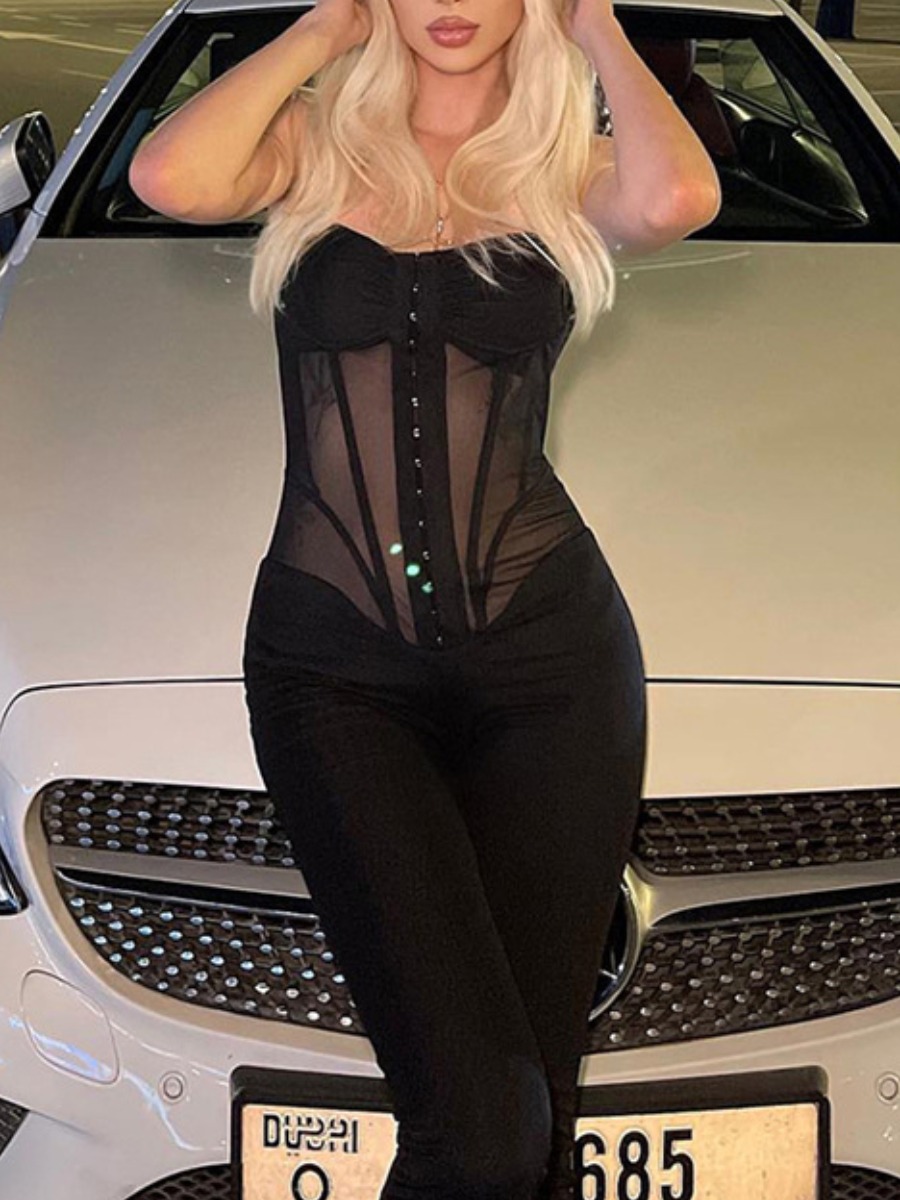 LW Mesh Patchwork Solid Color Jumpsuit.