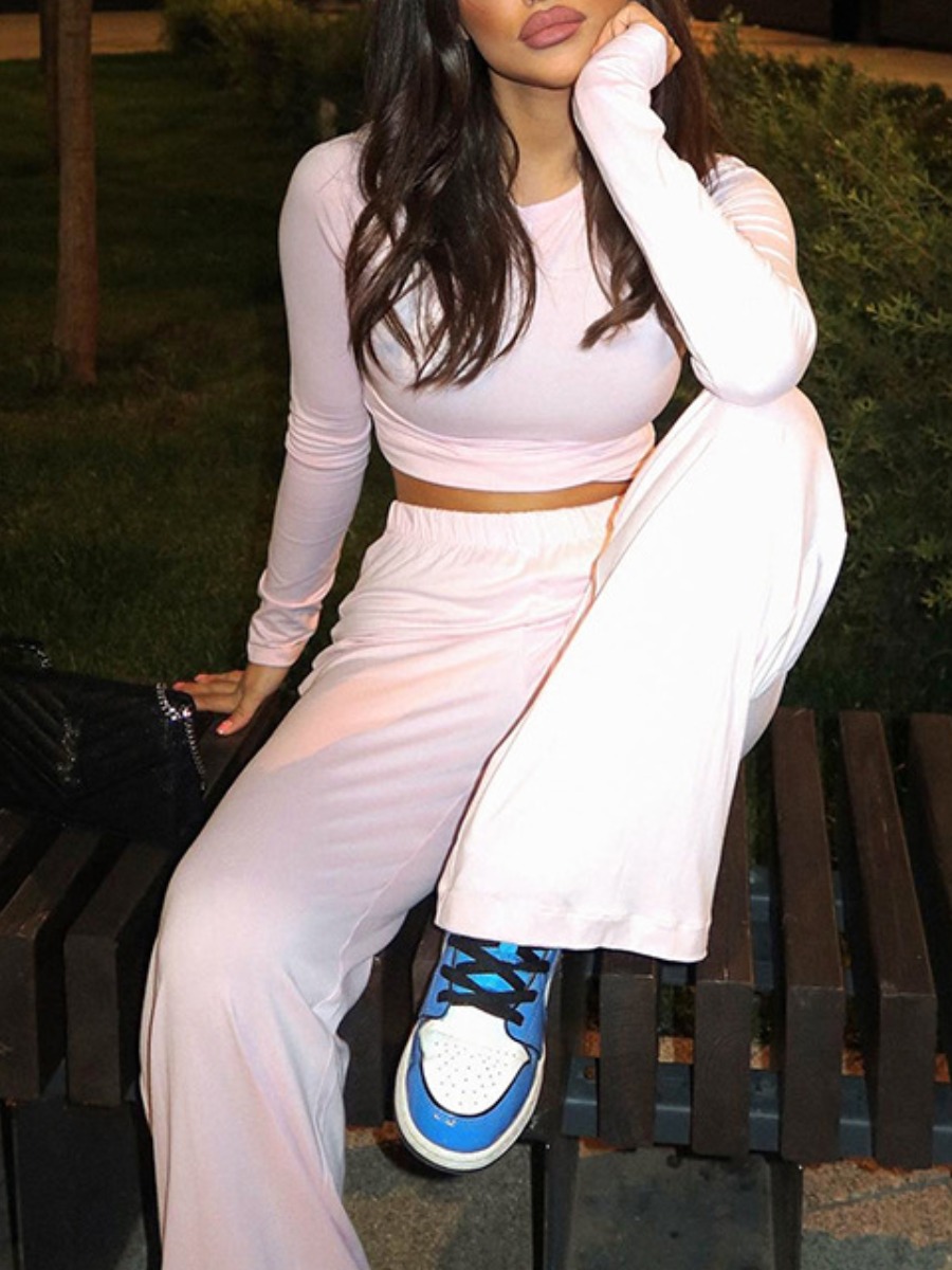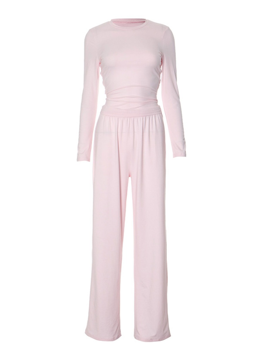 LW BASICS Casual Polyester Round Neck Solid Color Long Sleeve Two-piece Pants Set