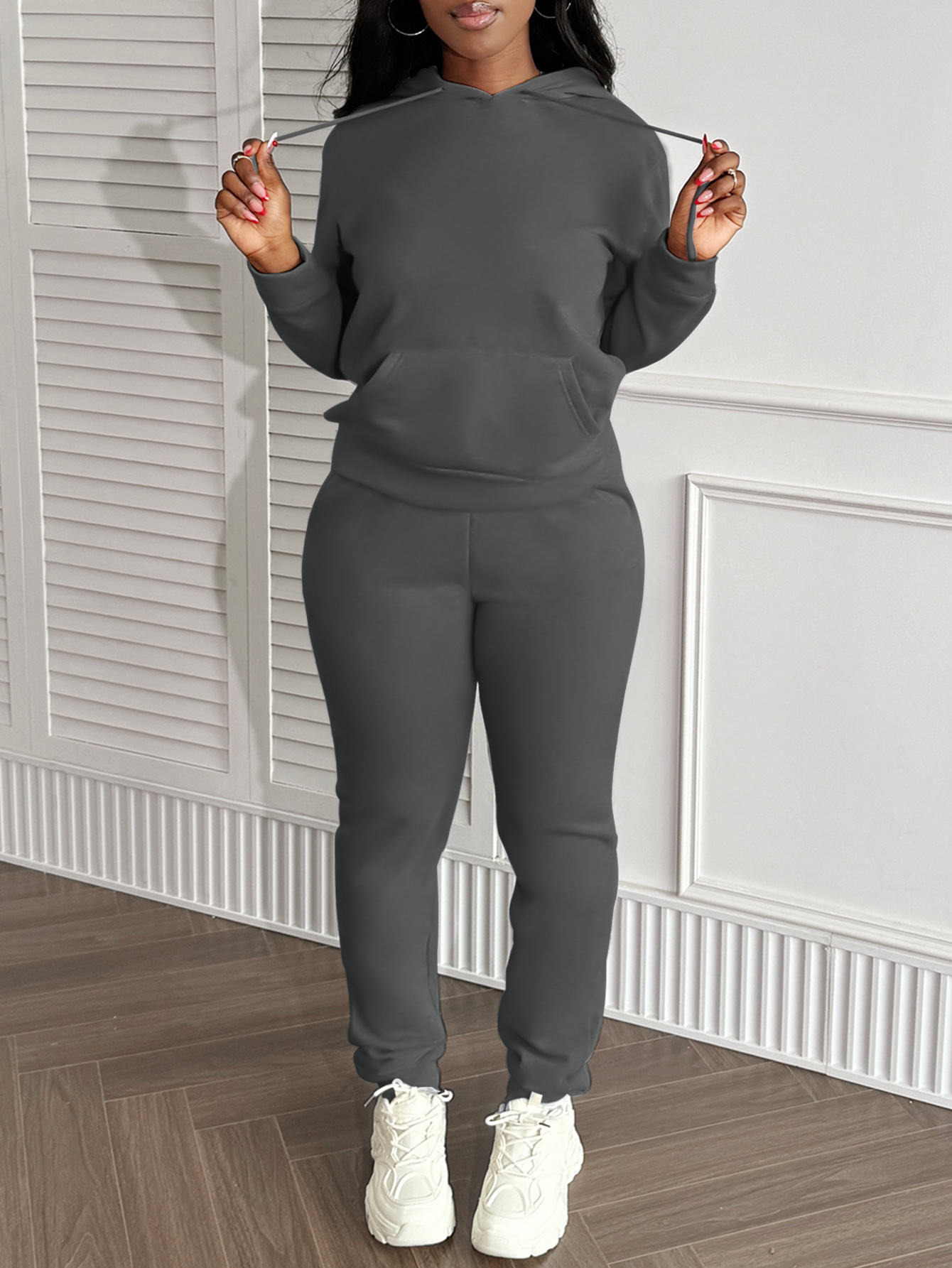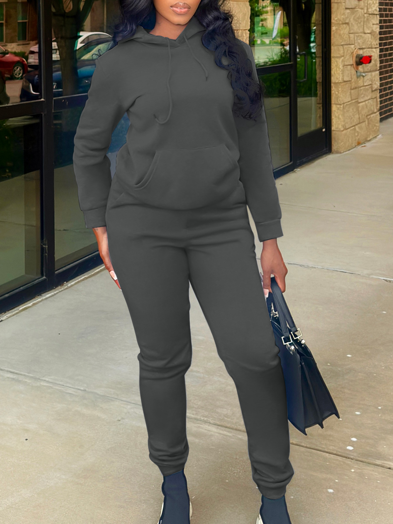 LW Casual Sweat Hooded Collar Lace Up Solid Color Long Sleeve Two-piece Pants Set