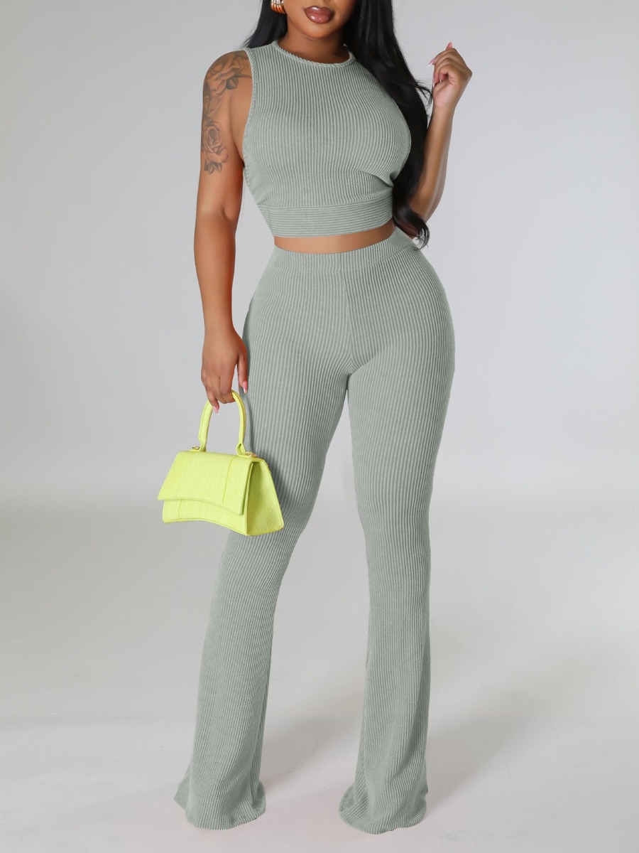 LW BASICS Casual Polyester Round Neck Vests Plain Sleeveless Two-piece Pants Set.