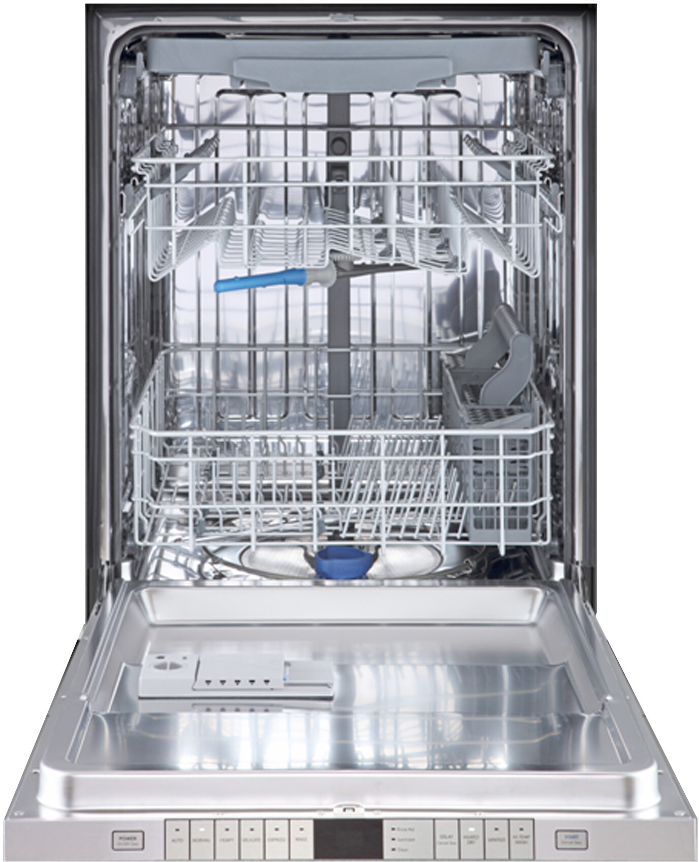 Fully Integrated Built-In Panel Ready Dishwasher with 14 Place Setting Capacity, 6 Wash Cycles, Third Cutlery Rack, 45dBA, and Smart Wash System. Large capacity that can hold 14 place settings due to adjustable upper rack height, stemware holders, fold down-tines in the bottom rack, and a third layer cutlery basket. Choose from six versatile wash cycles to suit your dishwashing needs, ensuring optimal cleaning performance. Maximize space and organization with a convenient third cutlery rack, providing additional room for silverware and utensils. Silent performance at 45dBA allows you to run it day or night, even when you entertain. Thanks to its Smart Wash System, it can determine the type of cycle required to clean the dishes and it will clean more efficiently every time. The Multiple Filter System helps for a better performance allowing the dishwasher to operate with less water and less energy. Ensure thorough cleaning coverage with three powerful spray arms, targeting every corner of your dishes. Upper, Middle, and Lower. For washing heavy soiled pots and pans. Customize interior space to accommodate various dish sizes and shapes with adjustable racks, offering flexibility and convenience. Stainless steel tub that resist corrosion and give a premium look helps to deliver outstanding drying performance. Your dishes are ready to use the minute you open your dishwasher thanks to the Dual Fan System (heating drying + fan drying) that creates a sustained fresh and dry air flow to dry the dishes. The cycle progress indicator, in the form of three lights located on the right side of the front of the dishwasher, will indicate the current wash cycle while the dishwasher is running. Interior tub lighting with LED illumination makes it easier to see the interior of the tub for loading and unloading. Accepts a cabinet face on the front so you can match your kitchen design or install it hidden from sight. Featuring a sleek and durable stainless steel exterior, this dishwasher adds a touch of modern sophistication to your kitchen while offering long-lasting performance. With concealed electronic touch controls that are located on top of the dishwasher LED display for a sleeker appearance. Capacity: 14 Place Settings. Type: Built-In. Color: Panel Ready. Control Type: Digital. Electronic Display: Yes. Control Style: Fully Integrated. Recessed Handles: No. Child Lock: Yes. Adjustable Upper Rack: Yes. Fold-Down Tines: Yes. Rack Material: Vinyl. Third Rack Type: Cutlery Tray. Cup Shelves: Yes. Stemware Holder: Yes. Tall Tub: Yes. Stainless Steel Interior: Yes. Number of Spray Arms: 3. Rinse Aid Dispenser: Yes. Water Filtration: Yes. Water Heating: Yes. Fingerprint Resistant: No. Leveling Legs: Yes. Interior Light: Yes. Auto Detergent Dispenser: Yes. Wash Cycles: 6. Wash Options: 4. Delay Start: Yes. Dry Type: Heated & Vented. Hard Food Disposer: No. High Temperature Wash: Yes. NSF Certified Rinse: Yes. Quick Wash Setting: Yes. China/Crystal Setting: Yes. Sanitize Cycle: Yes. Sensor Clean: Yes. Heavy Duty Wash: Yes. Sound Level: 45 dBA. Leak Protection: No. Rinse & Hold: No. Steam Wash: No. Half Load Option: No. Delicate Wash: Yes. Volts: 120 V. Amps: 15 A or 20 A. Frequency: 60 Hz. Product Width: 23 4/5". Product Depth: 25 1/5". Product Height: 33 4/5". Shipping Width: 32". Shipping Length: 32". Shipping Height: 41". Net Weight: 94 lbs. Gross Weight: 120 lbs. Parts and Labor: 4 Year.