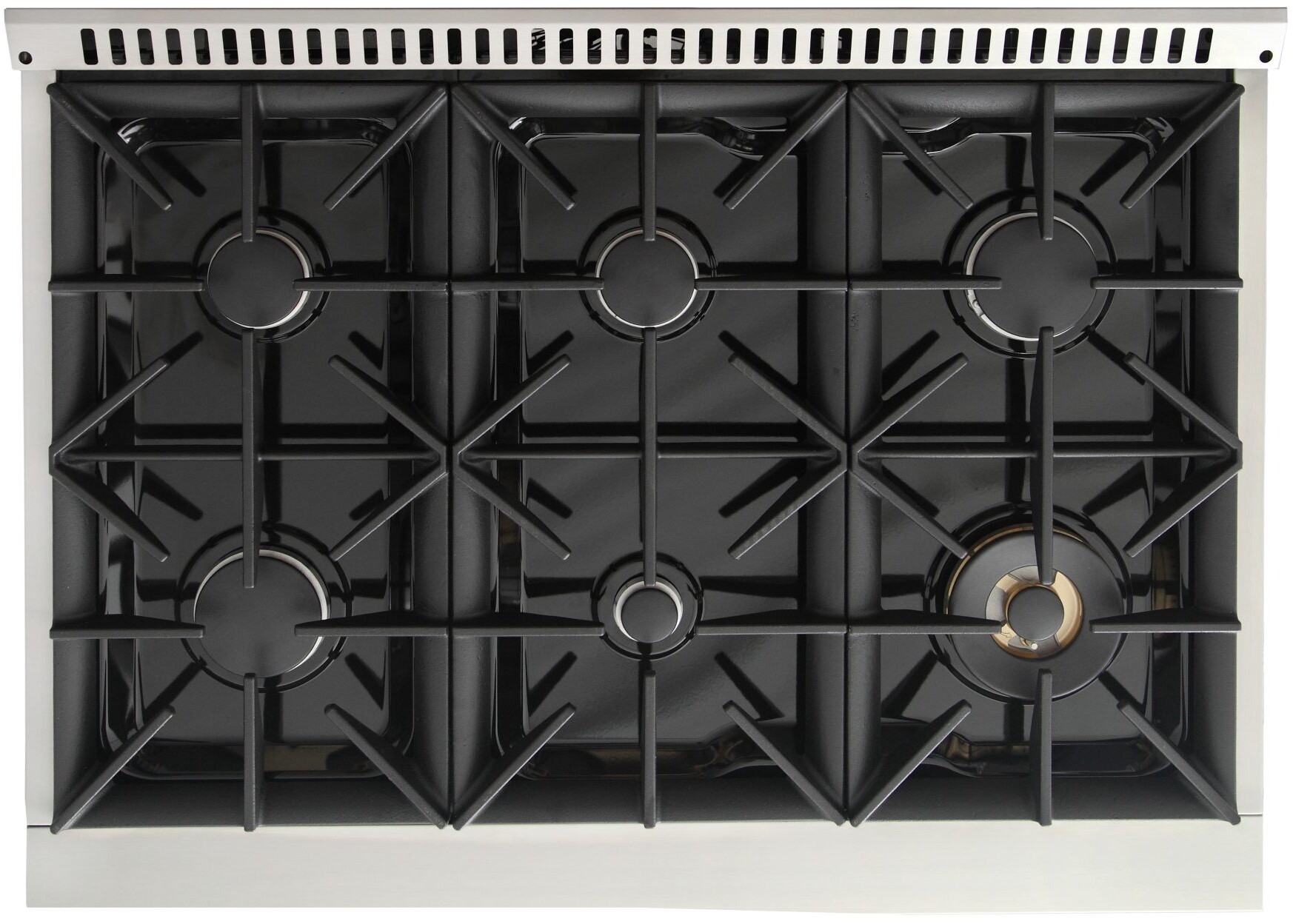 Freestanding Dual Fuel Range with 6 Sealed Burners, 5.2 Cu. Ft. Oven Capacity, Convection Oven, Halogen Lights, 4" Stainless Steel Backsplash, Black Porcelain Cooktop, Blue Porcelain Oven Interior, Electronic Ignition with Auto Re-Ignition, and Continuous Cast-Iron Grates: Silver Oven Door - Silver Knobs, Gold Handle & Ring / LP. Enhance your kitchen's elegance with a sleek black porcelain top, adding a touch of sophistication to your cooking space. Enjoy a stylish and vibrant oven interior with blue porcelain, elevating the aesthetics of your cooking experience. Experience precision and durability with premium metal control knobs, ensuring effortless adjustments and long-lasting performance. Keep an eye on your culinary creations with ease through the extra-large oven window, allowing for convenient monitoring of your dishes' progress. Achieve professional-grade results with heavy-duty cast-iron cooking grates, providing even heat distribution and sturdy support for your cookware. Elevate the overall look of your kitchen with full stainless steel side panels, ensuring a seamless and polished appearance from every angle. Complete the professional aesthetic of your kitchen with a sturdy and stylish professional handle, offering both functionality and timeless elegance. Illuminate your culinary creations with precision using two halogen lights, ensuring a well-lit oven interior for effortless monitoring. Experience enhanced heat retention and safety with a double-layered glass window, providing efficient insulation while allowing you to observe your dishes as they cook. Maximize your oven's cooking capacity with two sturdy oven racks, offering flexibility to accommodate various dishes simultaneously. Customize your appliance's height and stability with fully adjustable heavy-duty legs, ensuring a perfect fit in any kitchen space. Take control of your cooking experience with manual oven control, allowing you to adjust settings according to your preferences and recipes. Enjoy hassle-free cooking with electronic ignition featuring auto re-ignition, ensuring reliable performance and seamless operation. Explore versatile cooking options with manual convection cooking mode, providing even heat distribution for exceptional results. Rest easy knowing your appliance is backed by a comprehensive four-year warranty for both parts and labor, offering peace of mind and confidence in your investment. Type: Freestanding. Gas: Dual Fuel. Oven Capacity: 5.2 Cu. Ft. # of Burners: 6. Burner Type: Sealed Burners. Oven BAKE (Two-Element): 3,000 W (Base) & 850 W (Top). Broiler Heating Element: 3,500 W (Top). Burner 1: 20,000 BTUs (Dual Burner with Simmer). Burner 2: 15,000 BTUs. Burner 3: 12,000 BTUs. Burner 4: 9,000 BTUs. Burner 5: 9,000 BTUs. Burner 6: 6,000 BTUs. Cooktop Material: Black Porcelain. Oven Interior Material: Blue Porcelain. Cooktop Control Type: Knobs. Oven Control Type: Knobs. Control Knob Type: Premium Quality Metal Control Knobs. Extra Large Oven Window: Yes. Heavy Duty Cast-Iron Cooking Grates: Yes. Full Stainless Steel Side Panels: Yes. Handle Type: Professional Handle. Oven Lighting: 2 halogen lights. Oven Door: 2 layers glass window. # of Oven Racks: 2. Fully Adjustable Heavy-duty Legs: Yes. Ignition Type: Electronic Ignition with Auto Re-ignition. Manual Convection Cooking Mode: Yes. Volts: 240 V. Amps: 30 A. Overall Width: 36". Overall Depth: 28 7/8". Overall Height: (40" with backsplash). Net Weight: 290 lbs. Shipping Weight: 349 lbs. Shipping Width: 32". Shipping Depth: 42". Shipping Height: 55". Parts & Labor: 4 Years.