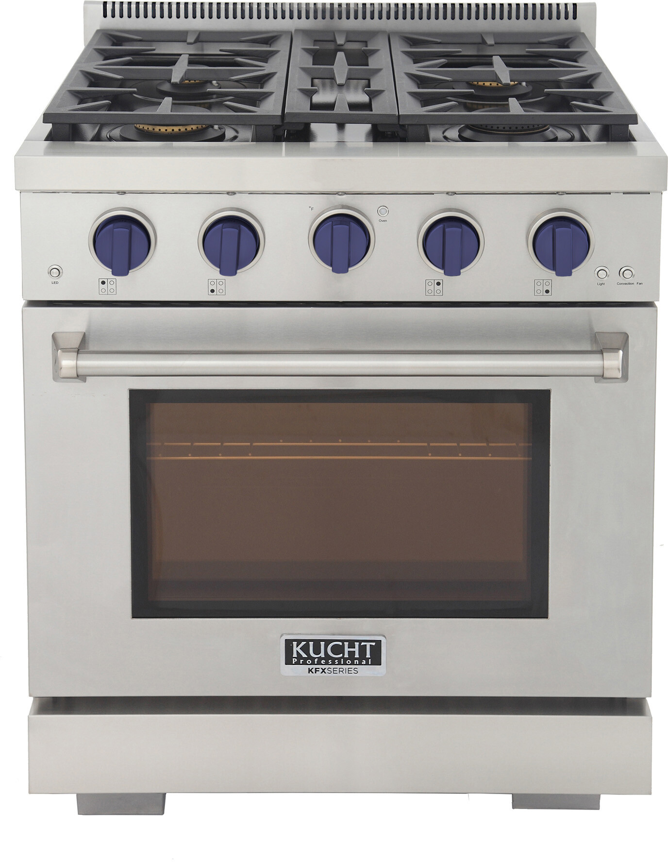 Freestanding Gas Range with 4 Sealed Burners, 4.2 Cu. Ft. Oven Capacity, 22,000 BTU Convection Oven, 16,500 BTU Infra-red Broiler, Continuous Heavy-Duty Cast-Iron Grates, Stainless Steel Backsplash, Electronic Ignition with Auto Re-ignition: Stainless Steel with Blue Knobs, LP. Four sealed burners provide efficient and controlled heat distribution for precise cooking. Unlock enhanced cooking versatility with the manual convection cooking mode, empowering you to achieve perfectly even baking and roasting results with precision control and efficiency. The auto-reignition system ensures safety and convenience by automatically relighting the burner if the flame is accidentally extinguished. Enhance your kitchen's aesthetics and functionality with the stainless steel backsplash, adding a sleek and durable surface that protects your walls from splatters and spills while seamlessly complementing your appliances. Continuous grates offer seamless movement of pots and pans across the cooking surface, making it easy to slide cookware without lifting. The heavy-duty cast-iron cooking grates provide even heat distribution and are robust enough to support heavy cookware for reliable cooking performance. Enhance your cooking versatility with this optional accessory. Easily switch between a grill and griddle surface to accommodate various cooking styles and preferences. Series: KFX. Type: Freestanding Range. Fuel Type: Natural Gas. Number of Burners: 4. Style: Sealed Burner. Control Type: Knobs. Simmer Burner: Yes. Power Burner: Yes. Continuous Grates: Yes. Burner 1 Output: 21,000 BTU - Rocket Power Dual Burner with Simmer (Front Right). Burner 2 Output: 15,000 BTU (Front Left). Burner 3 Output: 12,000 BTU (Back Right). Burner 4 Output: 9,000 BTU (Back Left). Oven Capacity: 4.2 Cu. Ft. Convection Oven: 22,000 BTU. Broiler: 10,000 BTU. Volts: 120 V. Amps: 15 or 20 A. Frequency: 60 Hz. Product Width: 30". Product Depth: 29". Product Height: 36" (40" with Backsplash). Shipping Width: 32". Shipping Depth: 35". Shipping Height: 56". Net Weight: 224 lbs. Gross Weight: 279 lbs. Wok Stand: Not included. Grill/Griddle: Not included. Altitude Kit: Available. Parts and Labor: 4 Years.