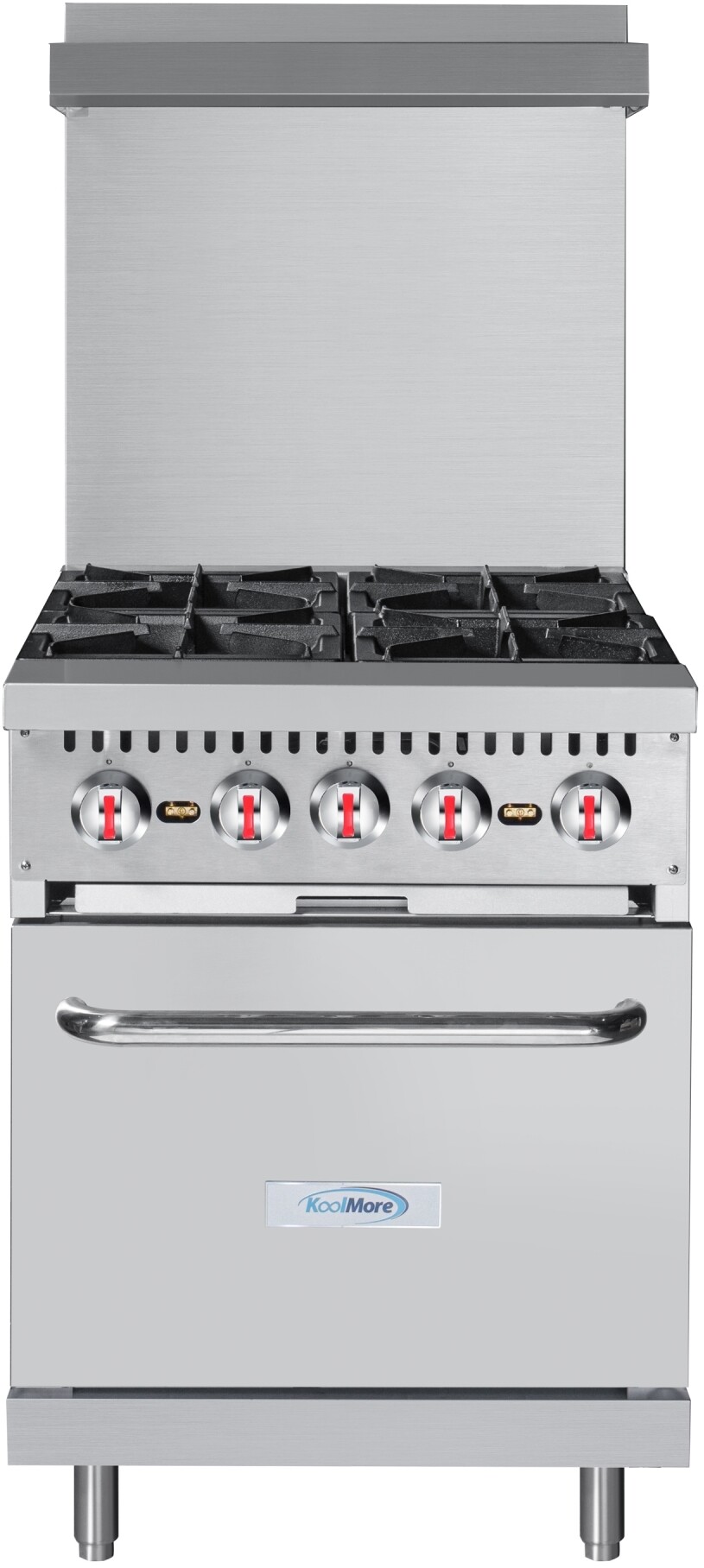24" Commercial Range with 4 Open-Top Burners, 4 cu.ft. Oven Capacity, Backsplash, Easy to Clean, and Built-In Shelf: Liquid Propane. High Performance open top burners offer rapid and precise heating. Large Oven Capacity with room for various dishes. Boasts a wide/tall backsplash to help keep your space cleaner. A shelf built-in above, so you can keep extra pots, pans, and supplies within easy reach. A compatible set of rolling caster wheels (KM-CR-CASTERS) for the unit to make it easier to slide away from the wall or move when its time for deep cleaning. Color Finish: Silver White. Temperature Range: 250-550. Controller Type: Manual. Plug Type: NEMA 5-15P. Number Of Burners: 4. Type of Burners: Double Row Hole. Burner 1 BTU: 30000. Burner 2 BTU: 30000. Burner 3 BTU: 30000. Burner 4 BTU: 30000. Oven BTU: 30000. Thermometer: No. Height: 60.3". Width: 32.7". Length: 24". Interior Height: 13.7". Interior Width: 25.8". Interior Depth: 20.6". Weight: 291 lbs.