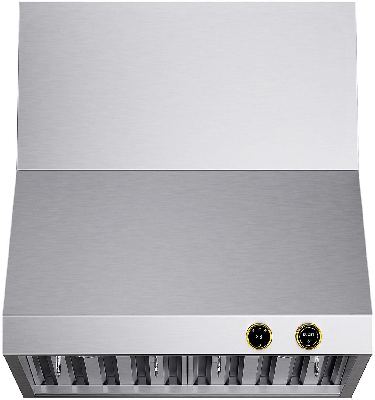 Wall Mount Range Hood with 3-Speed, Digital Dial Touch-Screen Controls, Dishwasher-Safe Baffle Filters, and LED Lighting: - 900 CFM Blower. This powerful pro-style range hood will give proper ventilation to your Kucht pro-style range with high BTU output while performing in a quiet operation with 3-speed levels. This pro-style range hood features 900CFM that will give you different levels of airflow and capture smoke and cooking odors in a quiet operation. Two round digital dial touch-screen controls, that match the round knobs of any stove, and are the perfect match for our exclusive Horus Digital Dial Thermostat featured on the KX Series. This stylish range hood comes with four stainless steel baffle filters that are also dishwasher-friendly. Equipped with 1.5-watt LED lights, this seamless design pro-style range hood will give you better visibility while cooking and enhance the look of your pro-style Kucht range. This high-quality 1.0 mm thickness 430-grade stainless steel pro-style range hood will enhance the look of your gourmet kitchen. The 5-minute delay-off feature keeps the hood running after cooking to ensure smoke and odors have cleared the environment, without affecting the lamp light setting. For better ventilation performance and efficiency. Style: Chimney Style. Type: Hood. Color: Stainless Steel with Gold Finish. Fingerprint Resistant: No. Glass Canopy: No. Mounting Type: Wall Mounted. Venting Type: Ducted. Blower Included: Yes. Blower Type: Internal. CFM: 900. Duct Size: 8". Number of Fan Speeds: 3. Filter Type: Baffle. Dishwasher Safe Filters: Yes. Adjustable Lighting Levels: Yes. Lighting Type: LED. Bulb Included: Yes. Number of Bulbs Included: 2. Delay Shut-Off: Yes. Volts: 120 V. Amps: 15 A. Frequency: 60 Hz. Product Width: 30". Product Depth: 23". Product Height: 18". Shipping Width: 40". Shipping Length: 48". Shipping Height: 39". Product Weight: 65 lbs. Shipping Weight: 83 lbs. Warranty: 4 Years Warranty for Parts & Labor - Lifetime Video Chat Support with KUCHT Specialist.