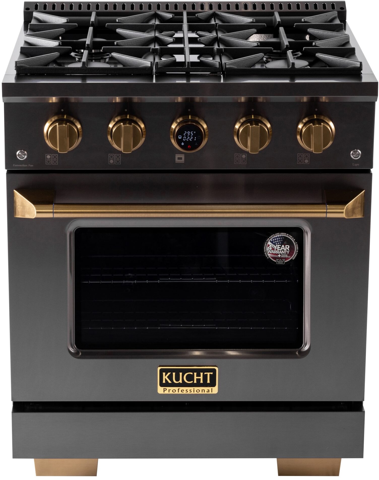 Freestanding Dual Fuel Range with 4 Sealed Burners, 4.2 Cu. Ft. Oven Capacity, Convection Oven, Kucht Horus Thermostat, Gold Control Knobs, Black Porcelain Top, Continuous Cast-Iron Grates, Electronic Ignition with Auto Re-ignition, Adjustable Telescopic Shelves and 4" Stainless Steel Backsplash: Natural Gas. The Horus Digital Dial Thermostat in the KX SERIES ensures precision and user-friendly operation, providing accurate temperature control and easy adjustments for optimal cooking performance. The sleek black porcelain top provides a durable and easy-to-clean cooking surface, enhancing both style and functionality. Enjoy a visually striking and easy-to-maintain blue porcelain oven interior that adds a touch of elegance to your appliance. Experience precision and durability with premium quality metal control knobs, designed for smooth and accurate adjustments. Monitor your cooking progress with ease through the extra-large oven window, providing clear visibility without opening the door. Cook with confidence using heavy-duty cast-iron cooking grates, offering superior heat retention and even cooking. The full stainless steel side panels provide a seamless and durable finish, enhancing the overall design and durability of your range. The professional handle adds a touch of commercial-grade quality and style, ensuring a firm and comfortable grip. Illuminate your oven interior with two halogen lights, offering bright and energy-efficient lighting for easy monitoring. The 2 layers glass window improves insulation, maintaining consistent oven temperatures while providing safety and energy efficiency. Maximize your cooking space with two oven racks, allowing for flexible arrangement and multi-level cooking. Achieve perfect alignment and stability with fully adjustable heavy-duty legs, accommodating various counter heights. Enjoy precise and reliable temperature adjustments with manual oven control, giving you full control over your cooking. Benefit from the convenience and safety of electronic ignition with auto re-ignition, ensuring your burners stay lit during cooking. Enhance your baking and roasting with manual convection cooking mode, delivering even heat distribution for superior results. Rest assured with a 4-year warranty for parts and labor, providing peace of mind and reliable support for your appliance. Series: KX Series. Type: Freestanding Range. Fuel Type: Natural Gas. Number of Burners: 4. Style: Sealed Burner. Control Type: Knobs & Horus Digital Dial Thermostat. Continuous Grates: Yes, Heavy Duty Cast-Iron. Electric Ignition: Auto Re-Ignition. Backsplash: 4" Stainless Steel. Full Stainless Steel Side Panels: Yes. Professional Handle: Yes. Oven Interior: Blue Porcelain. Cooktop: Black Porcelain. Fully Adjustable Heavy-Duty Legs: Yes. Burner 1: 15,000 BTU. Burner 2: 15,000 BTU. Burner 3: 9,000 BTU. Burner 4: 9,000 BTU. Oven Capacity: 4.2 Cu. Ft. Oven BAKE (Two-Element): 3,000 W (Base) & 850 W (Top). Broiler Heating Element: 3,500 W (Top). Oven Lights: 2 Halogen. Oven Racks: 2. Convection Cooking: Manual Mode. Volts: 240 V. Amps: 40 A. Frequency: 60 Hz. Plug Type: Nema 14-50P. Product Width: 30". Product Depth: 28 7/8". Product Height: 36" (40" with Backsplash). Shipping Width: 32". Shipping Depth: 35". Shipping Height: 46". Net Weight: 195 lbs. Gross Weight: 205 lbs. Wok Stand: Not included. Parts and Labor: 4 Years.