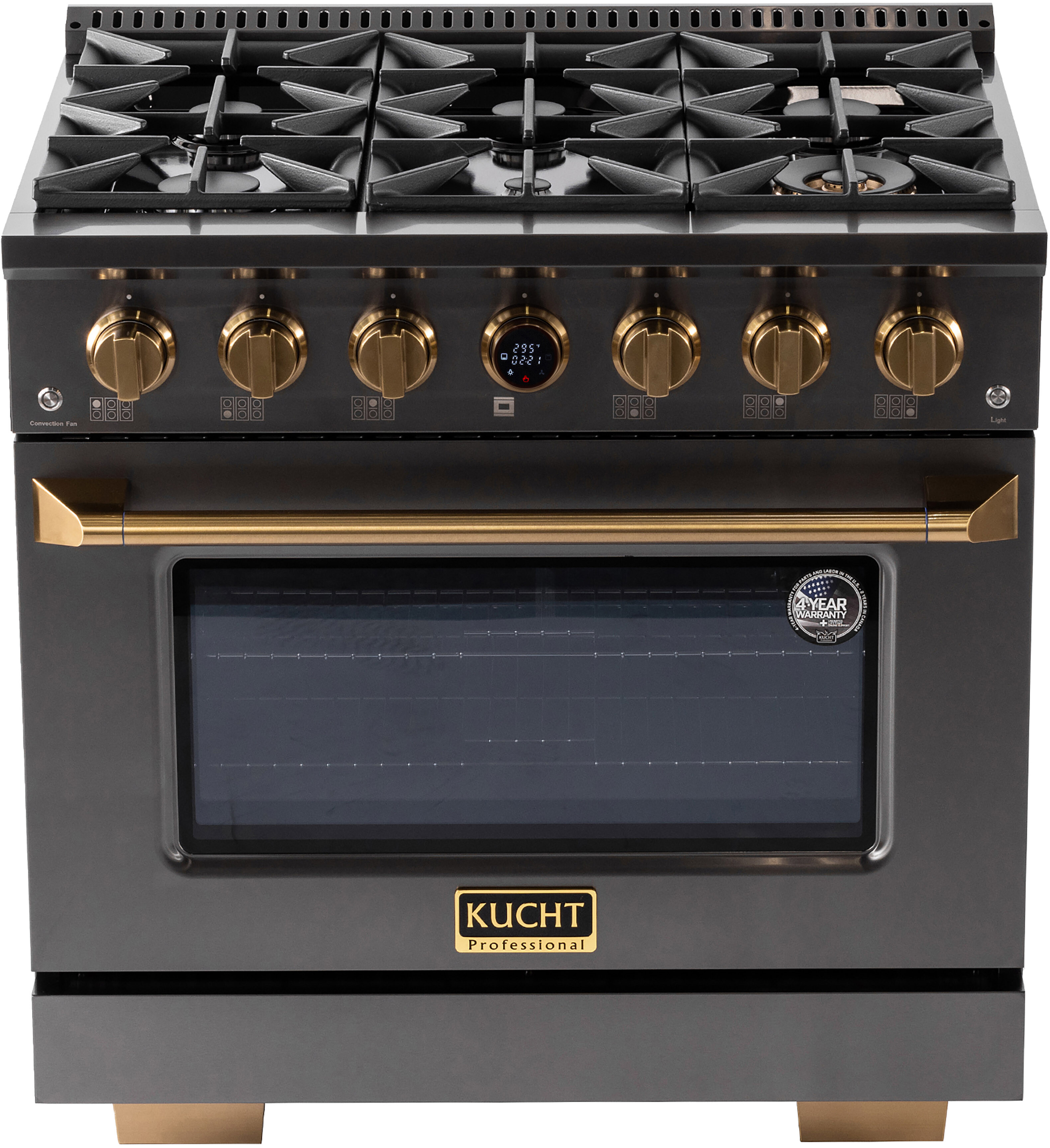 Freestanding Dual Fuel Range with 6 Sealed Burners, 5.2 Cu. Ft. Oven Capacity, Convection Oven, Kucht Horus Thermostat, Gold Control Knobs, Black Porcelain Top, Continuous Cast-Iron Grates, Electronic Ignition with Auto Re-ignition, Adjustable Telescopic Shelves and 4" Stainless Steel Backsplash: Natural Gas. The Horus Digital Dial Thermostat in the KX SERIES ensures precision and user-friendly operation, providing accurate temperature control and easy adjustments for optimal cooking performance. The sleek black porcelain top provides a durable and easy-to-clean cooking surface, enhancing both style and functionality. Enjoy a visually striking and easy-to-maintain blue porcelain oven interior that adds a touch of elegance to your appliance. Experience precision and durability with premium quality metal control knobs, designed for smooth and accurate adjustments. Monitor your cooking progress with ease through the extra-large oven window, providing clear visibility without opening the door. Cook with confidence using heavy-duty cast-iron cooking grates, offering superior heat retention and even cooking. The full stainless steel side panels provide a seamless and durable finish, enhancing the overall design and durability of your range. The professional handle adds a touch of commercial-grade quality and style, ensuring a firm and comfortable grip. Illuminate your oven interior with two halogen lights, offering bright and energy-efficient lighting for easy monitoring. The 2 layers glass window improves insulation, maintaining consistent oven temperatures while providing safety and energy efficiency. Maximize your cooking space with two oven racks, allowing for flexible arrangement and multi-level cooking. Achieve perfect alignment and stability with fully adjustable heavy-duty legs, accommodating various counter heights. Enjoy precise and reliable temperature adjustments with manual oven control, giving you full control over your cooking. Benefit from the convenience and safety of electronic ignition with auto re-ignition, ensuring your burners stay lit during cooking. Enhance your baking and roasting with manual convection cooking mode, delivering even heat distribution for superior results. Rest assured with a 4-year warranty for parts and labor, providing peace of mind and reliable support for your appliance. Series: Gemstone - KX Series. Type: Freestanding Range. Fuel Type: Natural Gas. Number of Burners: 6. Style: Sealed Burner. Control Type: Knobs & Horus Digital Dial Thermostat. Continuous Grates: Yes, Heavy Duty Cast-Iron. Electric Ignition: Auto Re-Ignition. Backsplash: 4" Stainless Steel. Full Stainless Steel Side Panels: Yes. Professional Handle: Yes. Oven Interior: Blue Porcelain. Cooktop: Black Porcelain. Fully Adjustable Heavy-Duty Legs: Yes. Burner 1: 20,000 BTU dual burner with simmer. Burner 2: 15,000 BTU. Burner 3: 12,000 BTU. Burner 4: 9,000 BTU. Burner 5: 9,000 BTU. Burner 6: 6,000 BTU. Oven Capacity: 5.2 Cu. Ft. Oven BAKE (Two-Element): 3,000 W (Base) & 850 W (Top). Broiler Heating Element: 3,500 W (Top). Oven Lights: 2 Halogen. Oven Racks: 2. Convection Cooking: Manual Mode. Volts: 240 V. Amps: 40 A. Frequency: 60 Hz. Plug Type: Nema 14-50P. Product Width: 36". Product Depth: 28 7/8". Product Height: (40" with Backsplash). Shipping Width: 32". Shipping Depth: 42". Shipping Height: 46". Net Weight: 290 lbs. Gross Weight: 303 lbs. Wok Stand: Not included. Grill/Griddle: Included. Parts and Labor: 4 Years.