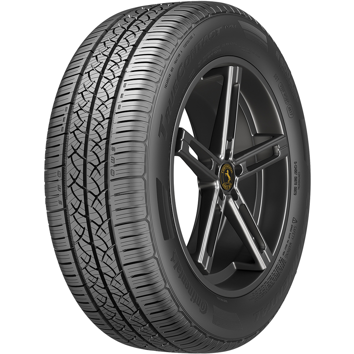 Continental TrueContact Tour. FEATURES AND BENEFITS: All season traction; Enhanced controllability; Visual tread indicators; Fuel efficient drive; . OVERVIEW: The Continental TrueContact Tour is a touring all season tire manufactured for passenger vehicles. Continental offers an 80,000 mile treadwear warranty with the H and T speed rated sizes, and a 70,000 mile treadwear warranty with the V speed rated tire sizes.The tire promotes great all weather traction. The all season compound and the special Traction Grooves increase the dry, wet and winter weather road gripping ability. The all season tire compound improves and maintains the tire's flexibility even in colder temperatures. The tread design's groove pattern and siping detail work together to find firm grip on the road surface in all weather. The circumferential and center angled lateral grooves prevent hydroplaning as they disperse water and slush from below the tire's footprint. The enhanced hydroplaning resistance and all season traction ensure a safer driving experience all year.The model was manufactured with the Tuned Performance Indicators that visually represent the tire's tread wear rate. The letter D, W and S represent the dry, wet and snow traction and they gradually wear out. When all three letters are visible the tire has good all weather traction. However, when the S wears off the tire, it means that the tire has reached the point where it no longer has good snow and winter traction. The same process goes for the wet and dry traction. The tire should be changed, at the latest, when only the last latter remains.The tire's special EcoContact Technology ensures its upgraded fuel efficiency. The technology uses the tire's compounds and structure to lower the tire's overall weight, without sacrificing its all weather traction, and with it decrease its rolling resistance. The rolling resistance is the force affecting the tire that determines the amount of energy the vehicle needs to keep the tires in motion. The reduced rolling resistance lessens the vehicle's fuel consumption and CO2 emissions, ensuring a fuel efficient and environmentally friendly drive.The Comfort Ride Technology guarantees a quiet and comfortable drive. The computer-designed tread pattern decreases the road noise levels heard while the tires are in motion. This tread design channels the airwaves through the tire's footprint and prevents them from coming into contact with the tread elements, which resists the formation of tread pattern noise. The model's internal construction features an underlay beneath the tread which absorbs the shock of driving. In this manner, the road vibrations do not reach the vehicle's cabin and don't disturb the comfort levels of the passengers.The TrueContact Tour is easily controlled. The tread design closely follows the road surface and maintains the tire's road contact at all times. As a result, the steering responsiveness and driving stability are improved. In other words, the structure is secured against the driving pressure affecting it, while the steering is faster and more precise in its responsiveness to the driver's commands. The better controllability enables the driver to confidently control the vehicle in all weather. Manufacturers recommend changing tires every 10 years. As long as tires are properly stored before they are sold, the year of their manufacture will not shorten their service life.