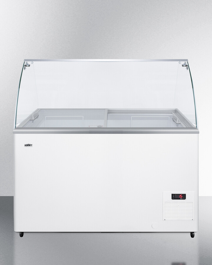 43" Freestanding Dipping Cabinet with 11.7 cu. ft. Capacity, Ice Cream Tub Holders, Glass Sneezeguard, Lock, Manual Defrost, Digital Thermostat, and UL-S Listed (Unassembled). Unit can store 4 tubs on the floor and display an additional 6 using the provided baskets. Three epoxy coated wire baskets with plastic lids included to hold standard ice cream tubs in place. Two extra epoxy-coated wire baskets packaged inside freezer for standard novelty treats. 3-piece glass sneezeguard made in Denmark with a curved front for optimum visibility. Two tempered glass lids on ball-bearing glides slide open and closed easily for added efficiency. Sneezeguard surface is finished in brushed aluminum to hold up to heavy duty use in busy commercial settings. A keyed lock is included for optional use. Front located for easier defrosting. Offers improved temperature performance throughout the interior. Static cooling system for improved temperature stability. Electronic controls for more precise temperature management. Digital thermostat can be set between -13 and +23F to accommodate a variety of frozen treats. Heavy duty wheels for smooth mobility (ship unassembled). 3" thick insulation helps to ensure items stay cold. Ice cream freezer made in Denmark with glass sneezeguard included for the optimum serving and storing conditions. Environmentally friendly design with no ozone-damaging chemicals. Eco-friendly hydrocarbon-based refrigerant for a greener footprint that meets current CARB regulations. UL-S listed to NSF-7 Standards for use in commercial establishments. Steel Interior. Easy Assembly. Capacity: 11.7 cu. ft. Defrost Type: Manual. Door: Glass. Cabinet: White. Door Swing: Sliding. Thermostat Type: Digital. Refrigerant Type: R290a. Temperature Range: -13 to 23F. Amps: 7.2. Voltage/Frequency: 115 V AC/60 Hz. Height of Cabinet: 49 1/2". Width: 43". Depth: 27 1/4". Interior Height: 26". Interior Width: 36 3/4". Interior Depth: 21". Compressor Step Height: 9 3/4". Compressor Step Width: 7 7/8". Compressor Step Depth: 21". Weight: 144 lbs. Shipping Weight: 220 lbs. Parts & Labor Warranty: 1 Year. Compressor Warranty: 5 Years. US Electrical Safety: UL. Canadian Electrical Safety: ULC. Sanitation: UL-S. Commercially Approved: UL-S Listed to NSF-7 Commercial Standards. CARB Compliant: Yes.