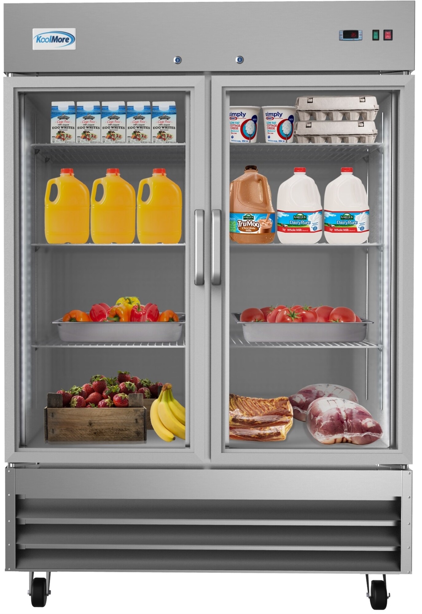 Commercial Freestanding All-Refrigerator with 47 cu. ft. Capacity, 6 Adjustable Shelves, Interior Lighting, Self-closing Door, Lock, Casters, and Digital Control. With a spacious 47 cu. ft. capacity, this refrigerator provides plenty of space for fresh ingredients, cooked meals, or beverages, ensuring you always have room to spare. Allows you to accommodate tons of different foods, containers, pans, and other cooking or baking ware. A raised bottom shelf made for convenient loading, unloading, and maintenance. Provides clear visibility of all stored items. Self-closing door with a stay-open feature for easy load. Includes pre-installed lock and key for guaranteed overnight freshness. Four casters with two breaks for increased mobility and easy cleaning. Glass Door allows you to easily see the contents. Great for separating different foods or food staples and accessing different items without impacting cold quality. External digital temperature controls and display for easy monitoring and temperature control. KoolMore's Reach-in Commercial refrigerator is built to stand up to all those heavy weekend restaurant loads and works great for bakeries, cafes and more. Preprogrammed Digital Controls Feature Auto-Defrost. Bottom Mounted Compressor. ETL Listed for Safety and Sanitation. Type: Reach-In. Capacity: 47 cu. ft. Color Finish: Stainless Steel. Door Type: Swing. Number of Doors: 2. Glass Door: Yes. Defrost Type: Automatic. Compressor Location: Bottom Mounted. Number of Shelves: 6. Shelf Material Type: Epoxy Coated. Interior Lighting: Yes. Door Lock: Yes. Casters: Yes, 4 / Included. Amps: 4.3. Hertz: 60. Voltage: 115. Plug Type: NEMA 5-15P. Width: 54". Depth: 32 1/4". Height: 82 1/2". Interior Width: 27 1/8". Interior Length: 49 3/8". Interior Height: 60 1/4". Shipping Width: 35". Shipping Length: 56 45/64". Shipping Height: 83 1/2. Weight: 448 lbs. Shipping Weight: 513 lbs. Certifications: ETL Listed. Parts & Labor Warranty: 1 Year.