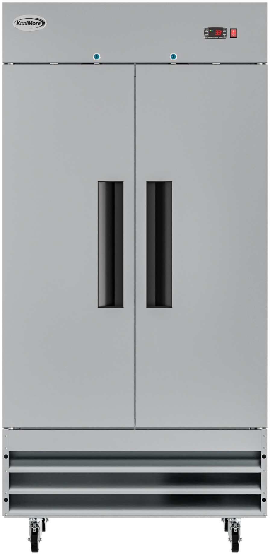 Commercial Freestanding All-Refrigerator with 35 cu. ft. Capacity, 6 Adjustable Shelves, Interior Lighting, Self-closing Door, Lock, Casters, and Digital Control. With a spacious 35 cu. ft. capacity, this refrigerator provides plenty of space for fresh ingredients, cooked meals, or beverages, ensuring you always have room to spare. Allows you to accommodate tons of different foods, containers, pans, and other cooking or baking ware. A raised bottom shelf made for convenient loading, unloading, and maintenance. Provides clear visibility of all stored items. Self-closing door with a stay-open feature for easy load. Includes a pre-installed lock and key to guarantee overnight freshness and prevent potential theft. Four casters with two breaks for increased mobility and easy cleaning. Great for separating different foods or food staples and accessing different items without impacting cold quality. External digital temperature controls and display for easy monitoring and temperature control. KoolMore's Reach-in Commercial refrigerator is built to stand up to all those heavy weekend restaurant loads and works great for bakeries, cafes and more. Preprogrammed Digital Controls Feature Auto-Defrost. Bottom Mounted Compressor. Recessed Door Handles. ETL Listed for Safety and Sanitation. Type: Reach-In. Capacity: 35 cu. ft. Color Finish: Stainless Steel. Door Type: Swing. Number of Doors: 2. Defrost Type: Automatic. Compressor Location: Bottom Mounted. Interior Material: Stainless Steel 201. Exterior Material: Stainless Steel 304. Number of Shelves: 6. Shelf Material Type: Epoxy Coated. Interior Lighting: Yes. Door Lock: Yes. Casters: Yes, 4 / Included. Amps: 4.1. Phase: 1. Voltage: 115. Plug Type: NEMA 5-15P. Width: 39". Depth: 29". Height: 82". Interior Width: 35". Interior Depth: 24 13/32". Interior Height: 51 19/32". Shipping Width: 32". Shipping Length: 42". Shipping Height: 85". Weight: 308 lbs. Shipping Weight: 374 lbs. Certifications: ETL Listed. Parts & Labor Warranty: 1 Year.