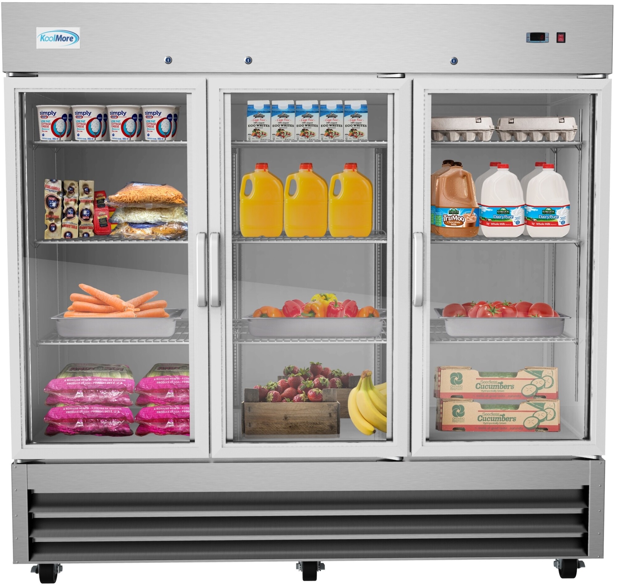 Commercial Freestanding All-Refrigerator with 72 cu. ft. Capacity, 9 Adjustable Shelves, Interior Lighting, Self-closing Door, Lock, Casters, and Digital Control. With a spacious 72 cu. ft. capacity, this refrigerator provides plenty of space for fresh ingredients, cooked meals, or beverages, ensuring you always have room to spare. Allows you to accommodate tons of different foods, containers, pans, and other cooking or baking ware. A raised bottom shelf made for convenient loading, unloading, and maintenance. Provides clear visibility of all stored items. Self-closing door with a stay-open feature for easy load. Includes pre-installed locks and keys for guaranteed overnight freshness and security. Six casters with three breaks for increased mobility and easy cleaning. Glass Door allows you to easily see the contents. Great for separating different foods or food staples and accessing different items without impacting cold quality. External digital temperature controls and display for easy monitoring and temperature control. Perforated interior back wall provides better air flow. KoolMore's Reach-in Commercial refrigerator is built to stand up to all those heavy weekend restaurant loads and works great for bakeries, cafes and more. Highly certified ETL Listed for Safety and Sanitation making it NSF ANSI 7 Standard for Commercial. Preprogrammed Digital Controls Feature Auto-Defrost. Bottom Mounted Compressor. Stainless Steel Exterior. Type: Reach-In. Capacity: 72 cu. ft. Color Finish: Stainless Steel. Door Type: Swing. Glass Door: Yes. Number of Doors: 3. Defrost Type: Automatic. Compressor Location: Bottom Mounted. Refrigerant Type: R-290. Interior Material: Stainless Steel 201. Exterior Material: Stainless Steel 304. Number of Shelves: 9. Raised Bottom Shelf: Yes. Shelf Material Type: Epoxy Coated. Temperature Control Type: External Digital. Interior Lighting: Yes. Door Lock: Yes. Casters: Yes, 6 / Included. Amps: 9.1. Hertz: 60. Voltage: 115. Plug Type: NEMA 5-15P. Width: 80 29/32". Depth: 32 1/4". Depth without Door: 29 13/32". Depth with Door at 90: 57 3/32". Height: 82 1/2". Interior Width: 76 1/4". Interior Depth: 27 1/8". Interior Height: 60 1/4". Shipping Width: 35". Shipping Length: 83 1/2". Shipping Height: 83 1/2". Weight: 614 lbs. Shipping Weight: 704 lbs. Certifications: ETL Listed for Safety and Sanitation. Parts & Labor Warranty: 1 Year.