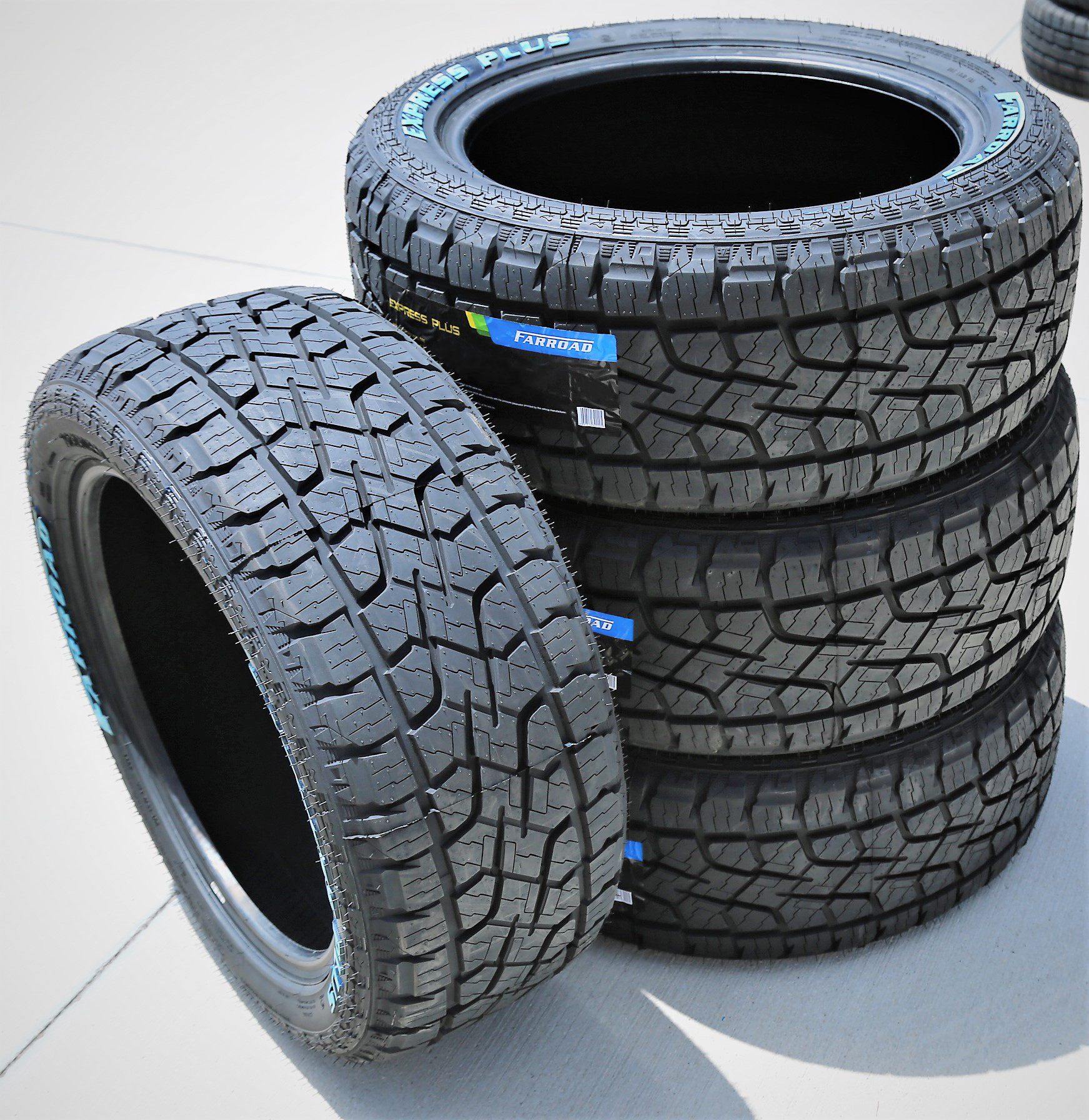 Farroad Express Plus. FEATURES AND BENEFITS: All terrain traction; All season traction; Enhanced controllability; Longer lasting tread life; . OVERVIEW: The Farroad Express Plus is an all terrain, all season tire made for SUVs and light trucks.All terrain traction is promoted. The staggered block pattern and wider grooves ensure the model's on- and off-road application. These elements firmly grip the road surface with extra biting edges, boosting the soft, loose, and uneven terrain performance. The tire's forward motion is guaranteed, which enables its versatile terrain driving safety. The footprint is kept clean by eliminating mud, snow, and rocks from between the tread elements. Stone retention is prevented with the tread design, optimizing the off-road driving safety.The tread design and all season compound also work together to boost the dry, wet, and winter weather grip. The sipe and notch placement across the tread area upgrades the number of biting edges being used, while the compound keeps the rubber flexible in versatile temperatures. During the tire's on-road performance, the grooves channel water and slush from the footprint. This effectively avoids hydroplaning and further increases the wet traction.Maintaining the surface contact helps to upgrade the controllability. The tread design with the stabilized footprint upgrades the surface contact at all times. This increases the steering responsiveness and driving stability, guaranteeing the driver's control over the vehicle. The reinforced internal structure keeps the ideal tire shape under the load and driving pressure. As the tire does not deform, it is able to effectively upgrade the overall load capacity throughout the performance.The Farroad Express Plus increases the length of its usability. The stabilized tread elements and durable compound enhance the service life. The compound utilizes wear-resistant compound elements which minimize the overall treadwear rate. It also allows the tire to evenly circulate the driving pressure across the tread area, combating uneven wear. This combination greatly enhances the tire's service and tread life.Manufacturers recommend changing tires every 10 years. As long as tires are properly stored before they are sold, the year of their manufacture will not shorten their service life.