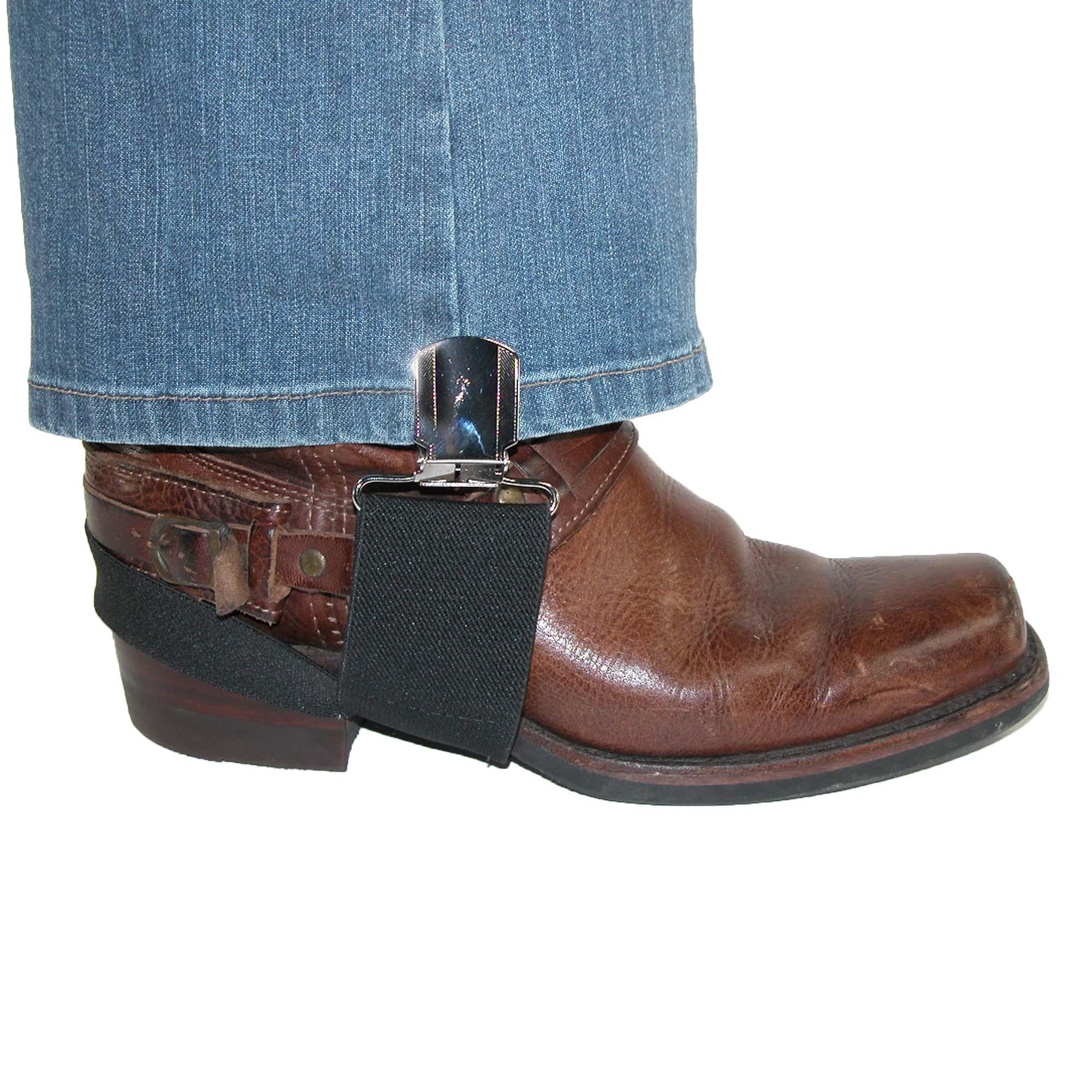 Keep your pants from hiking up while riding and enjoy a more comfortable experience with these stirrup straps! Just clip them to the bottom of your pants and around your shoe and you are ready to go! Elastic 2 Inch Wide Biker Double Pin Clip-End Stirrup Straps by CTM. Material is elastic. 2 shoe stirrups. Silver metal double pin clip-ends. Made in the USA.