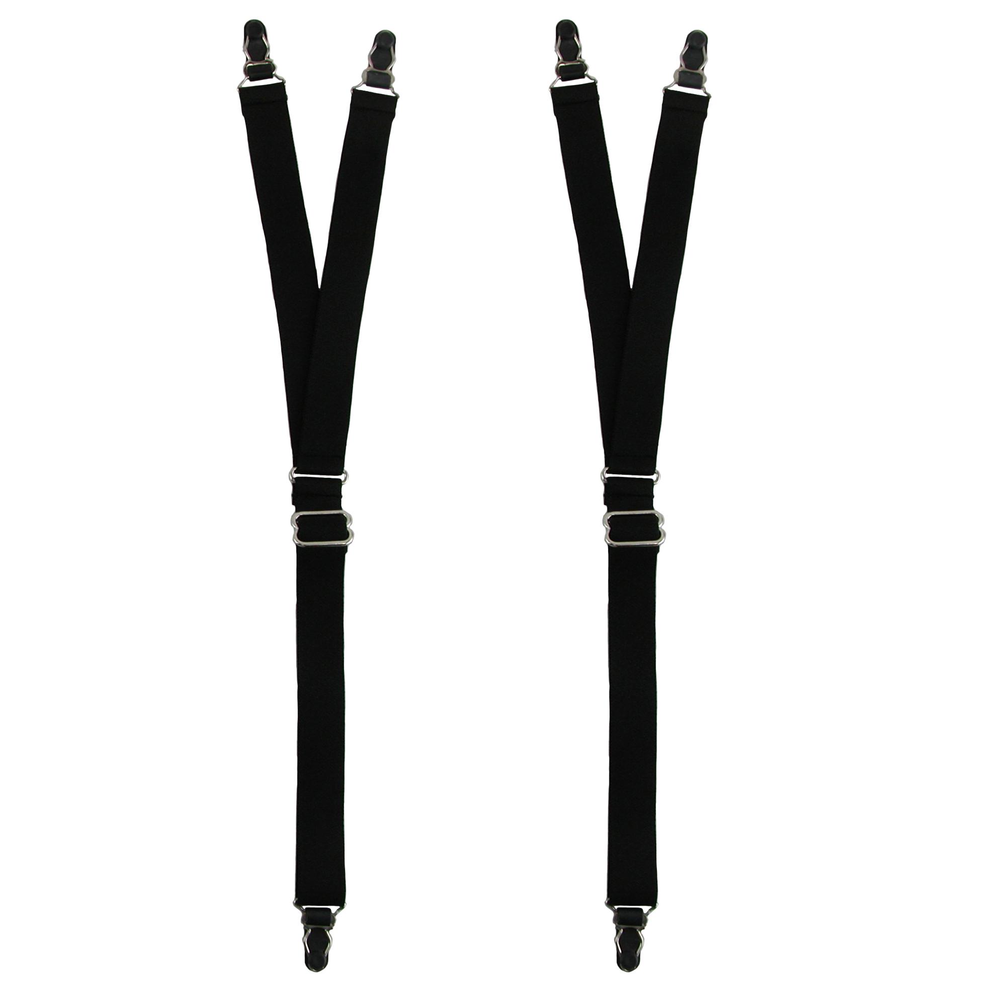 These garters are the perfect solution for a taller man to help keep his shirt tucked into his pants and his socks upright in place. The clips easily attach to both garments using the other to help keep it in line. Adjusts from 21-29 inches long. inch wide. Bottom part has a single grip clip top part splits to a Y with grip clips at both ends. Nickel metal adjusters. Made in the USA.