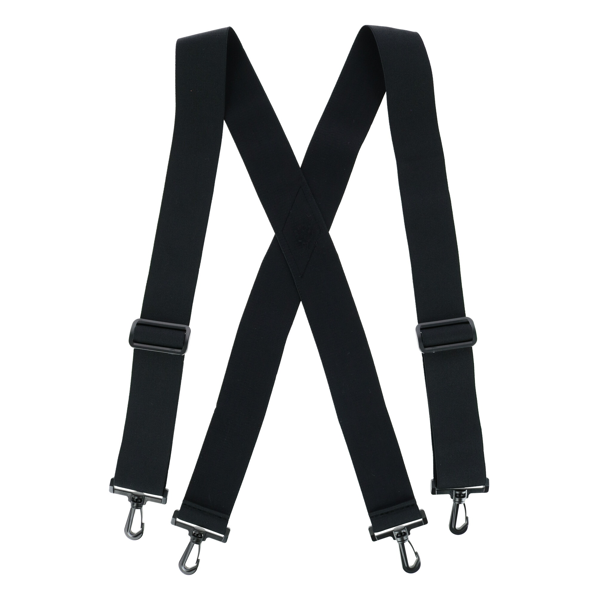 These suspenders can be worn under or over your clothing. They are made with ultra-soft elastic which lays comfortably against your skin. The adjusters and hook ends are plastic so you don't need to remove them when going through airport security. 2 inches wide. Adjusts from 39-55 inches long. X-back style with stitch back. Black plastic adjusters and swivel hooks. Made in the U.S.A.