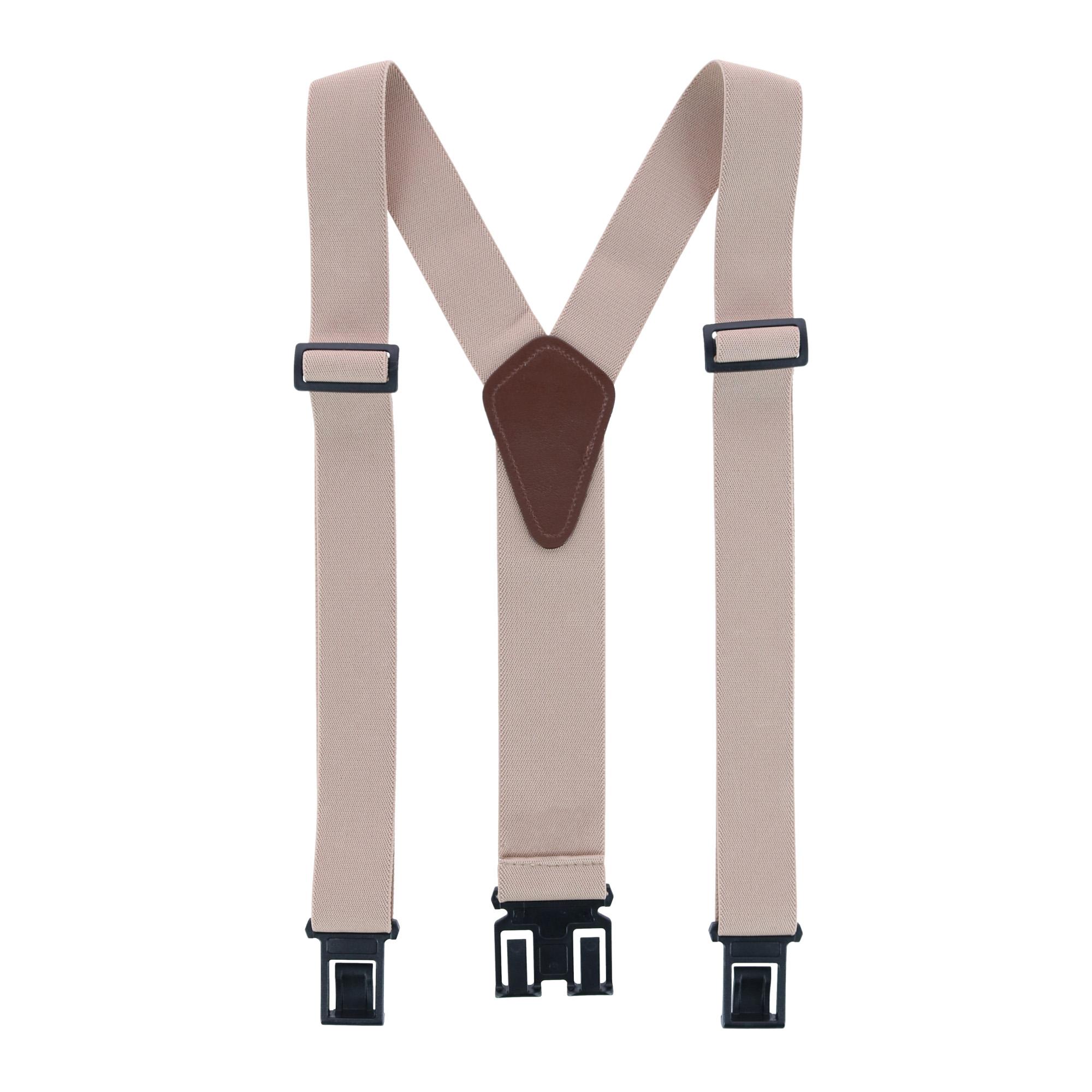 These suspenders are made with industrial strength materials and craftsmanship. The elastic holds firm and the heavy duty hook-ends easily attach to the bottom of a belt. 1.5 inches wide. Adjusts from 32-47.5 inches long. Y-back style with embossed leather back patch. Black heavy duty plastic adjusters and hook-ends. Hook-ends clip onto a belt.