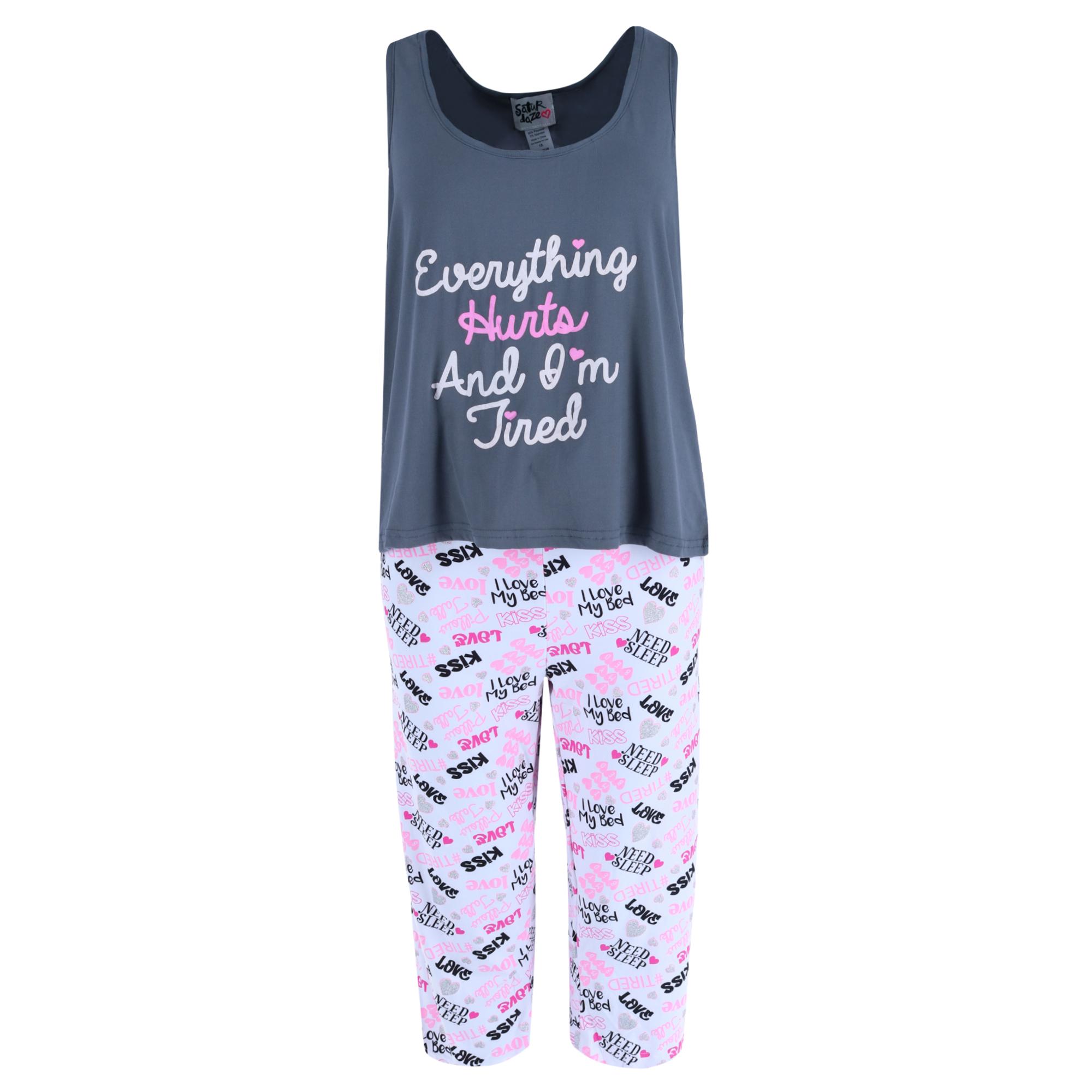 This cute 2 piece tank top and capri set is perfect to wear during those warmer months. Featuring a racerback style tank this top is super soft and has Hurts and Tired verbiage across. These pants feature relatable sayings such as need sleep I love my bed hashtag tired and much more. The capri pants have an elastic waistband and solid color bow for ultimate comfort. 2-piece tank top and capri set. Lightweight and soft material. Racerback tank top with Hurts And Tired verbiage. Capri pants with relatable verbiage. Elastic waistband and solid color bow.