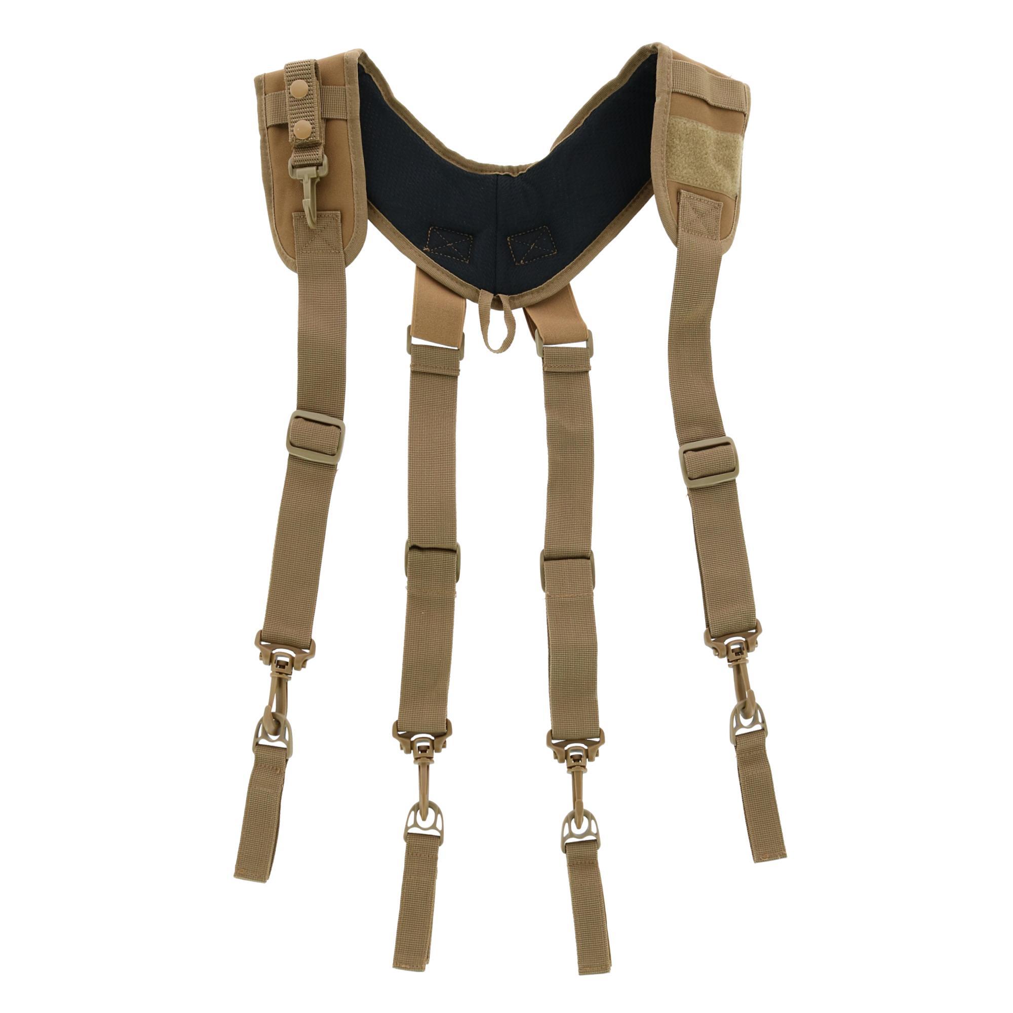 These heavy duty suspenders help keep everything in place and at your fingertips. The adjusters slide to a comfortable fit and the padded straps provide extra cushion. These suspenders feature swivel hook ends that easily attach to belt loops and removable loops for an optional tool belt. Non-elastic nylon straps with added on elastic pieces on back. 1.5 inches wide; adjusts from 49-62 inches long including tool belt loop and 41-54.5 inches long excluding tool belt loop. X-back style with padded back patch and shoulder straps. Plastic adjusters and swivel hook ends with a removeable nylon tool belt loop. Left strap has hook and loop patch and nylon strap and the right strap features a removeable key fob.